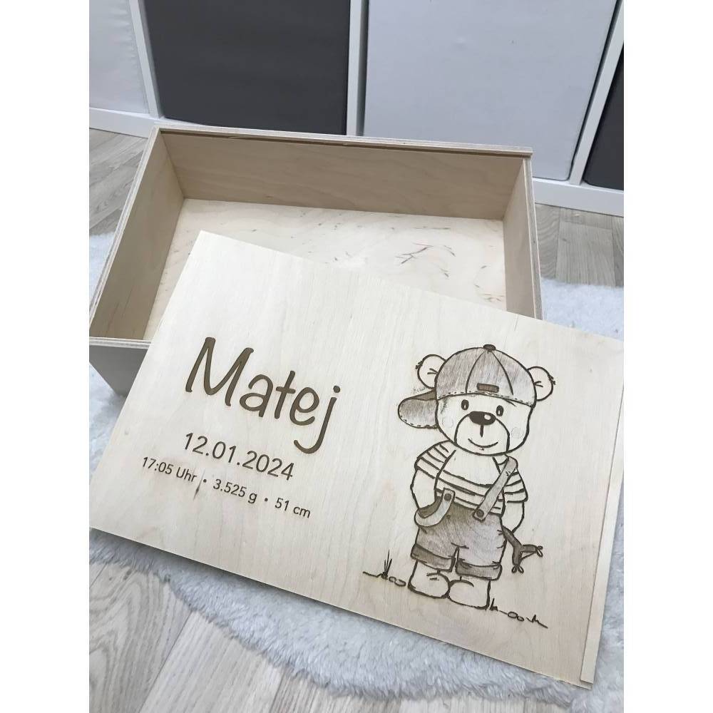 Herzlichen Glückwunsch zur Geburt! Diese personalisierte Erinnerungsbox ist das perfekte Geschenk für das neue Baby. Jeder Koffer wird in Handarbeit gefertigt - ein echtes Unikat! Auf den Deckel wird der Name des Babys und das Geburtsdatum graviert - unvergesslich und persönlich. Das süße Pusteblumen-Motiv in Türkis symbolisiert das Heranwachsen und Verbreiten von Glück. Maße: 25x17,5x8,5cm - genug Platz für die ersten Schuhe, die Geburtsmütze, die Taufkerze, Locke, Fotos und andere Schätze. Aus stabilem, beschichtetem Karton - schützt die Erinnerungen vor Staub und Licht. Perfekt zur Geburt, zur Taufe, zum ersten Geburtstag oder einfach als besondere Aufbewahrung für die Eltern. Wird fertig graviert geliefert - einfach auspacken und sich freuen. Ein Geschenk das ein Leben lang Freude bereitet und die schönsten Erinnerungen bewahrt. Einfach magisch!