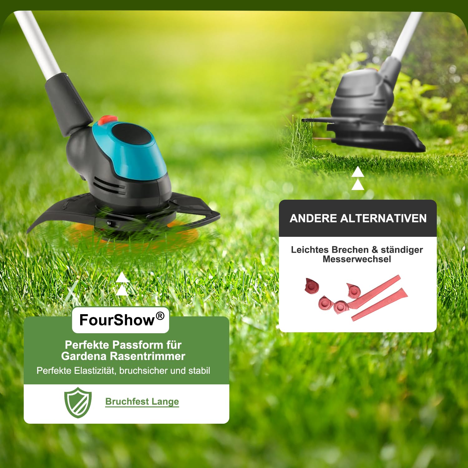 Hey du Gartenbesitzer! Wenn die Messer an deinem Gardena Rasentrimmer langsam abgenutzt sind, dann sind diese Flaveano Ersatzmesser genau das Richtige für dich! Im 100er-Set hast du lange was von den robusten Nylon-Messern, die speziell für Gardena Rasentrimmer entwickelt wurden. Sie passen perfekt für Modelle wie EasyCut Li-18/23 R, SmallCut Li-23R, ComfortCut Li-18/23 R und viele mehr - einfach vorher checken, ob dein Modell dabei ist! Die Messer nutzen Zentrifugalkraft und Aerodynamik, um den Luftwiderstand zu reduzieren - so schneiden sie nicht nur effizienter, sondern auch sauberer! Mit 30% besserer Gesamtleistung als viele Standard-Messer bekommst du hier echt was für dein Geld. Ein super Tipp: Weich die Messer am Abend vor dem Gebrauch in warmem Wasser ein - so werden sie noch langlebiger! Denk aber dran: Immer Schutzbrille, Handschuhe und lange Kleidung tragen, wenn du mit dem Trimmer arbeitest! Und Kinder sollten natürlich nicht in der Nähe sein. Also, wenn du deinen Rasentrimmer wieder auf Vordermann bringen willst und nicht jedes Mal teure Originalteile kaufen möchtest, dann sind diese Ersatzmesser genau dein Fall! Hol sie dir und mach deine Gartenarbeit einfacher!