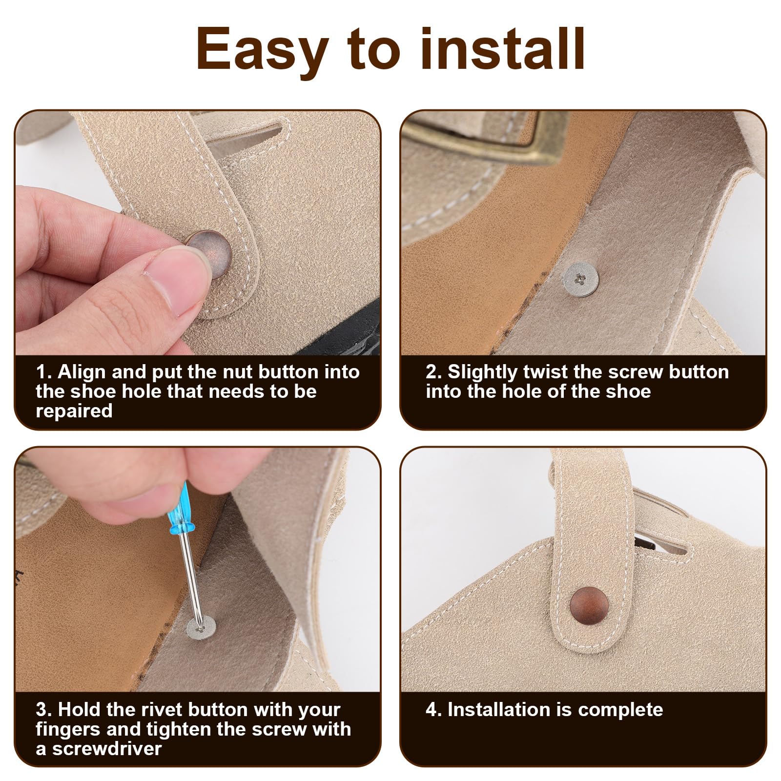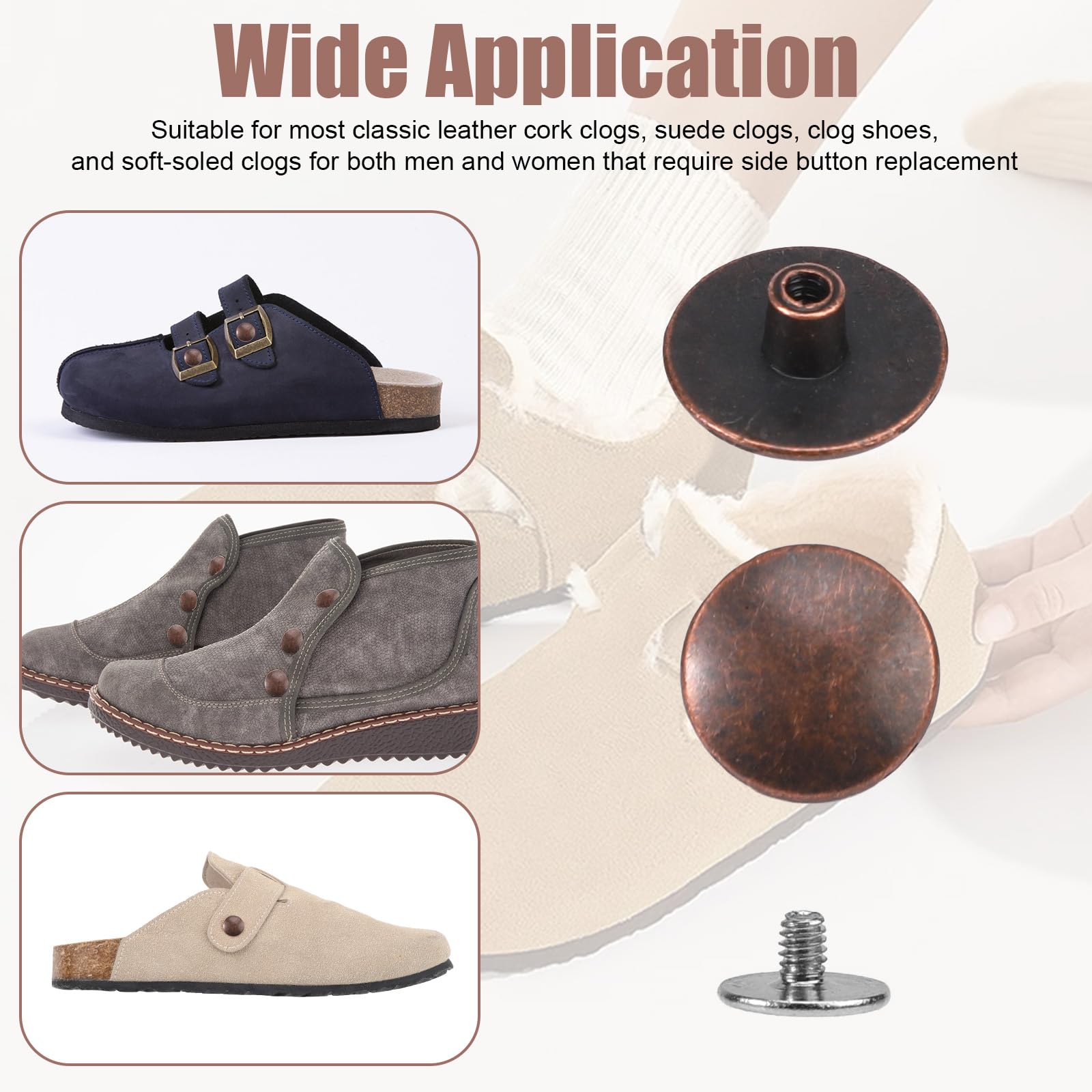 Deine liebsten Boston Clogs haben abgenutzte Nieten? Kein Problem! Mit diesem 8-teiligen Reparatur-Set machst du sie wieder wie neu. Aus hochwertiger Zinklegierung in bronzefarben, passend für Leder-, Kork- und Wildleder-Clogs. Inklusive praktischem Schraubendreher (45mm). Einfache Installation: Niete ins Loch setzen, mit Fingern halten und mit Schraubendreher festziehen. Die Nieten haben 12,5mm Kopfdurchmesser und 3,7mm Schwanzdurchmesser. Perfekt für Damen und Herren - gib deinen Clogs wieder den originalen Look!