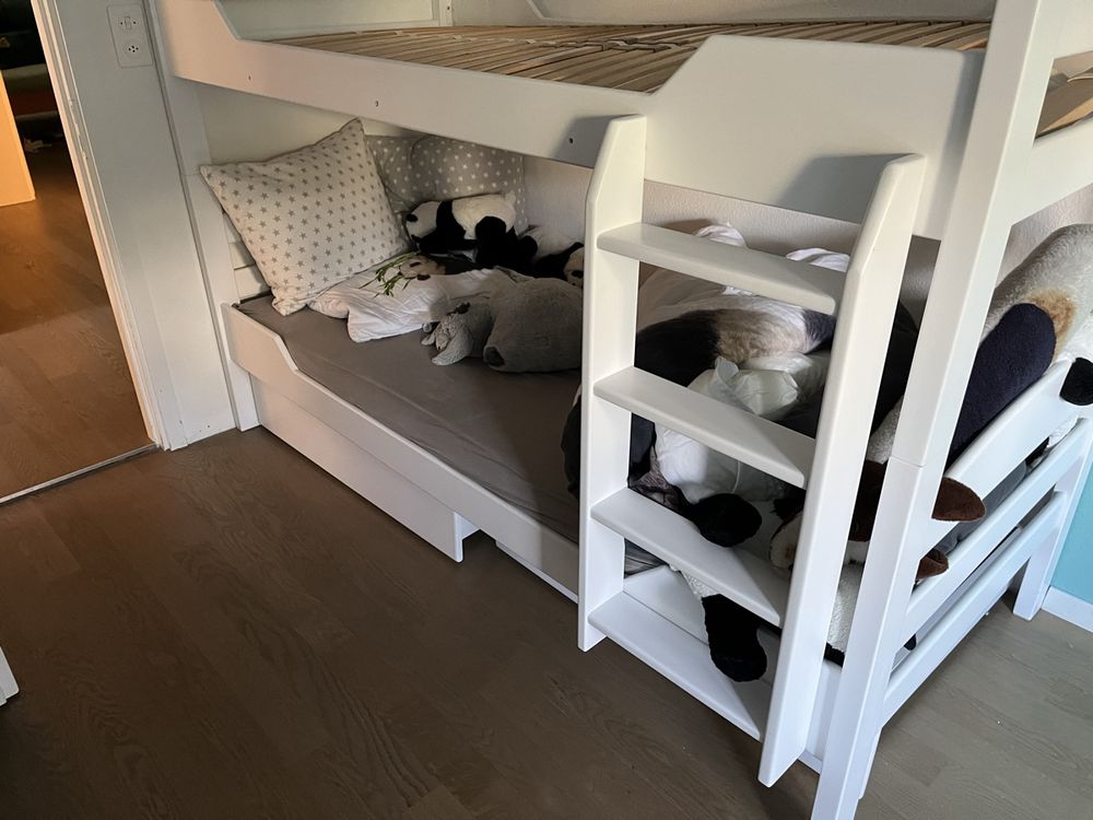 Dieses Etagenbett für Erwachsene ist der Platzsparer schlechthin! Aus massiver Buche in Natur - richtig stabil und langlebig. Mit 90x200cm Liegefläche und insgesamt 154cm Höhe. Das Beste: Es ist teilbar in zwei Einzelbetten - super flexibel! Inklusive zwei Rollrosten aus Lindenholz, Leiter, Sicherheitszaun und Rausfallschutz für oben. Die Pfosten sind extra stark mit 8x4cm - da ist nix wackelig! Nach EN 747 Norm gefertigt und aus FSC-zertifiziertem Holz. Einfacher Aufbau und spiegelverkehrt montierbar. Perfekt für Gästezimmer, Studentenwohnungen oder wenn's mal eng wird. 25,5cm Bodenfreiheit - da passt auch noch Stauraum drunter. Qualität die man sieht und spürt - da schläfst du gut und sicher!
