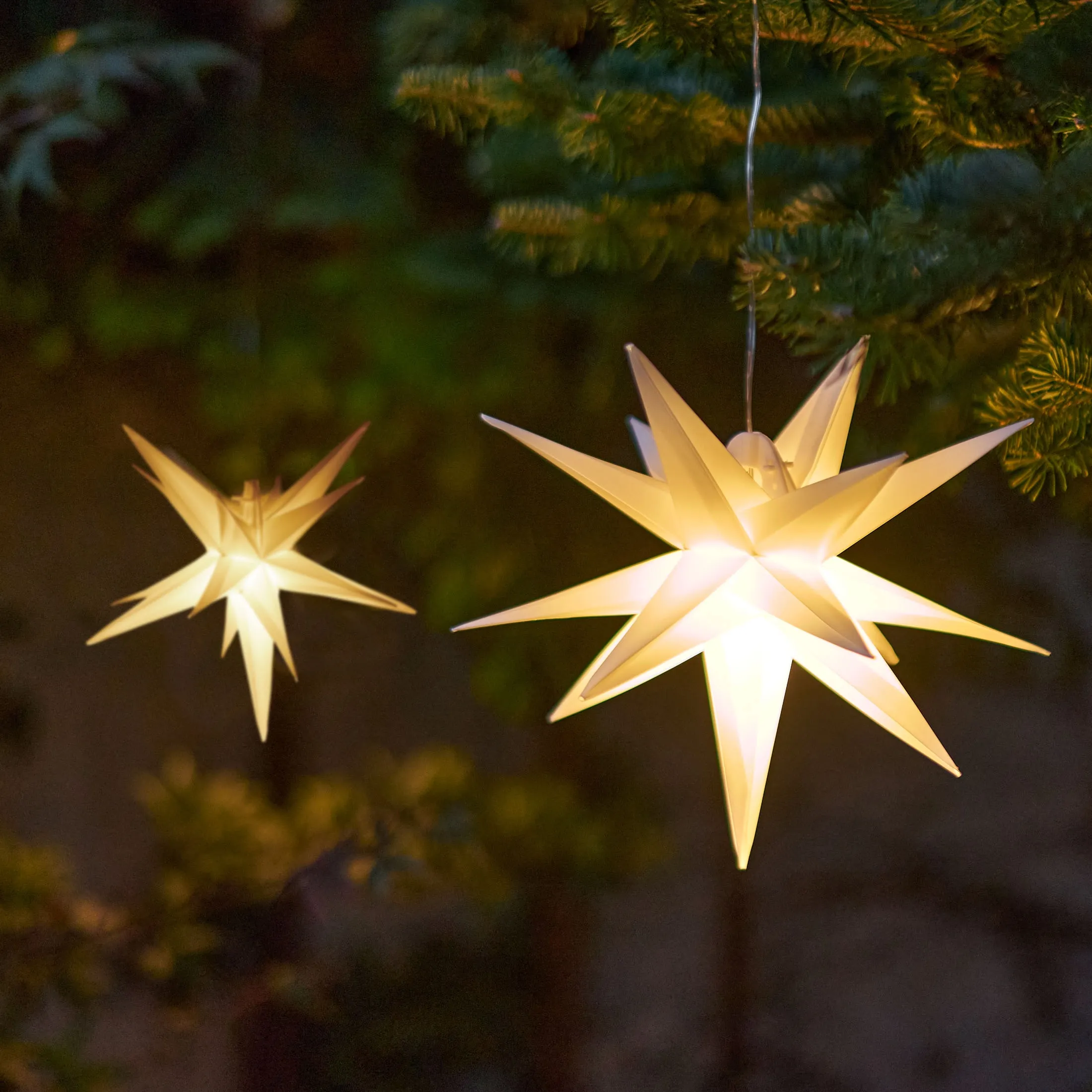 Weihnachtliche Stimmung ganz ohne Stromkosten! Dieses Set mit zwei Solar-Weihnachtssternen in 30 und 40 cm Größe bringt festlichen Glanz in deinen Garten. Aus robustem Metall mit 134 bzw. 180 warmweißen LEDs (2800K). Die Solarmodule mit Li-Ion Akku laden tagsüber auf, bei Dämmerung leuchten die Sterne automatisch bis zu 10 Stunden. Wetterfest mit IP44 - halten auch bei Frost stand. Mit Erdspießen und Aufhängungsöse für flexible Montage. Kabellänge je 5 Meter. Schafft eine gemütliche Weihnachtsatmosphäre im ganzen Garten!