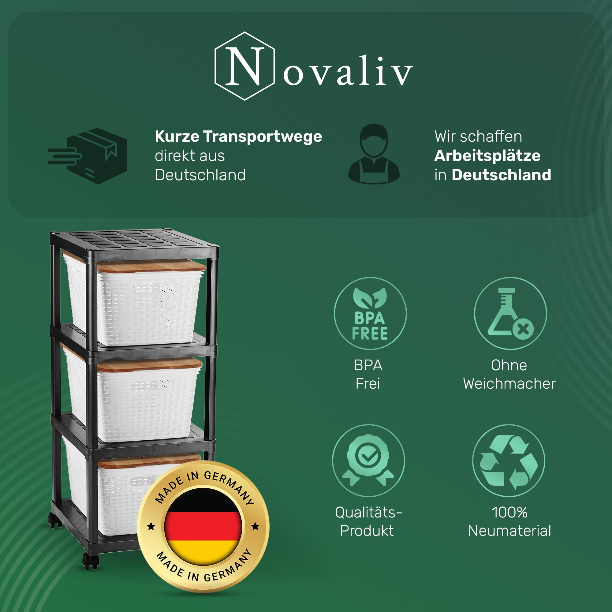 Ordnungswunder auf Rollen! Dieser praktische Novaliv Wagen mit 4 Etagen bringt System in jedes Chaos. Ob im Bad als Kosmetikwagen, in der Küche als Gewürzregal oder im Wohnzimmer als Zeitschriftenständer - mit den 4 stabilen Ebenen haben Sie alles griffbereit. Die optionalen Rattankörbe sorgen für extra Ordnung und Staubschutz. Mit 4 leichtgängigen Rollen (2 feststellbar) ist der Wagen super mobil und bleibt trotzdem standfest. Made in Germany aus BPA-freiem Kunststoff - langlebig und lebensmittelecht. Das schwarze Design mit Rattan-Optik sieht einfach klasse aus und passt in jedes Interior!