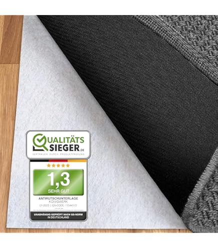 Endlich kein rutschen mehr mit dem Teppich! Diese Teppichunterlage von Steffensmeier hält deine Teppiche und Läufer sicher an Ort und Stelle - egal ob auf Fliesen, Laminat oder Parkett. Nur ca. 2mm stark, aber mega effektiv. Das Gitterdesign gibt deinem Teppich mehr Stabilität und verlängert seine Lebensdauer. Super einfach zu schneiden, passt du sie genau an deine Teppichgröße an. Das beste: Sie ist nach Öko-Tex Standard 100 zertifiziert (sogar für Babyartikel!) und komplett phthalatfrei. Aus PES und Glasgarngewebe ist sie strapazierfähig und elastisch. Einfach unter den Teppich legen und schon bleibt alles da, wo es hingehört. So macht Boden-Sicherheit Spaß!