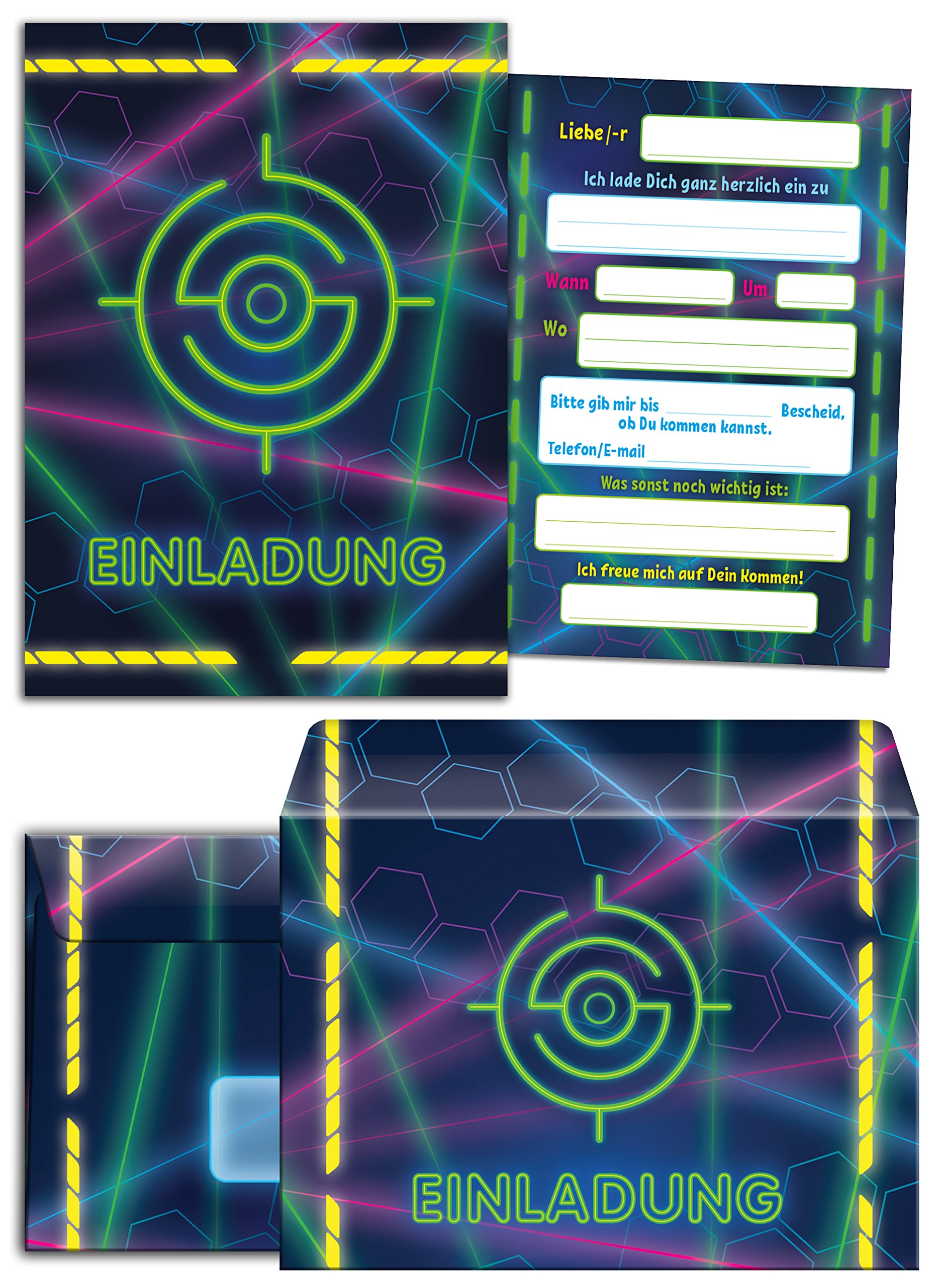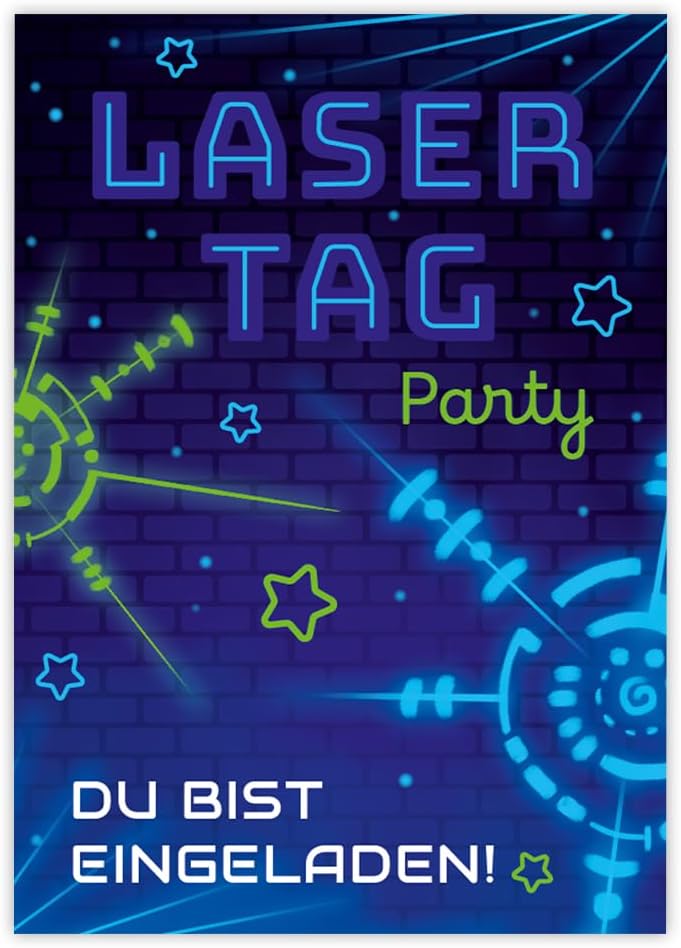 Lass die Vorfreude steigen mit diesen coolen Lasertag-Einladungskarten! Das 12er-Set im actionreichen Design begeistert Jungen und Mädchen gleichermaßen und macht jede Geburtstagsparty zu etwas Besonderem. Die Karten im praktischen A6-Format (10,5x14,8cm) sind aus stabilem 300g/m² Bilderdruckpapier gefertigt und mit UV-Lack veredelt. Vorgedruckte Felder für Datum, Uhrzeit, Ort und Telefonnummer machen das Ausfüllen super einfach - kein Stress mehr bei der Partyplanung! Mit allen gängigen Stiften beschreibbar und in Deutschland umweltfreundlich produziert. Perfekt für Lasertag-Partys, aber auch für andere Kindergeburtstage vielseitig einsetzbar. Mach die Einladung zur deines Events schon zum Highlight - deine Gäste werden begeistert sein!