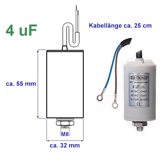 Für alle, die motorbetriebene Geräte reparieren: Dieser CBB60 Kondensator ist ein Allrounder! 20µF Kapazität bei 450V - perfekt für 50/60 Hz Netze. Zylindrisches Design 10x4,1cm - einfach zu installieren. Mit M8 Anschlussdrähten - kein Löten nötig. Robuste Konstruktion - geringer Energieverlust und selbstheilend. Perfekt für: Wasserpumpen, Klimaanlagen, Waschmaschinen, Poolpumpen, Luftkompressoren - einfach alle einphasigen Motoren. Garantiert effizienten Start und stabilen Betrieb. Überspannungsschutz - schützt deine Geräte. Ob im Haushalt oder in der Industrie - immer die richtige Wahl. Einfach ein essentielles Ersatzteil für jede Werkstatt!