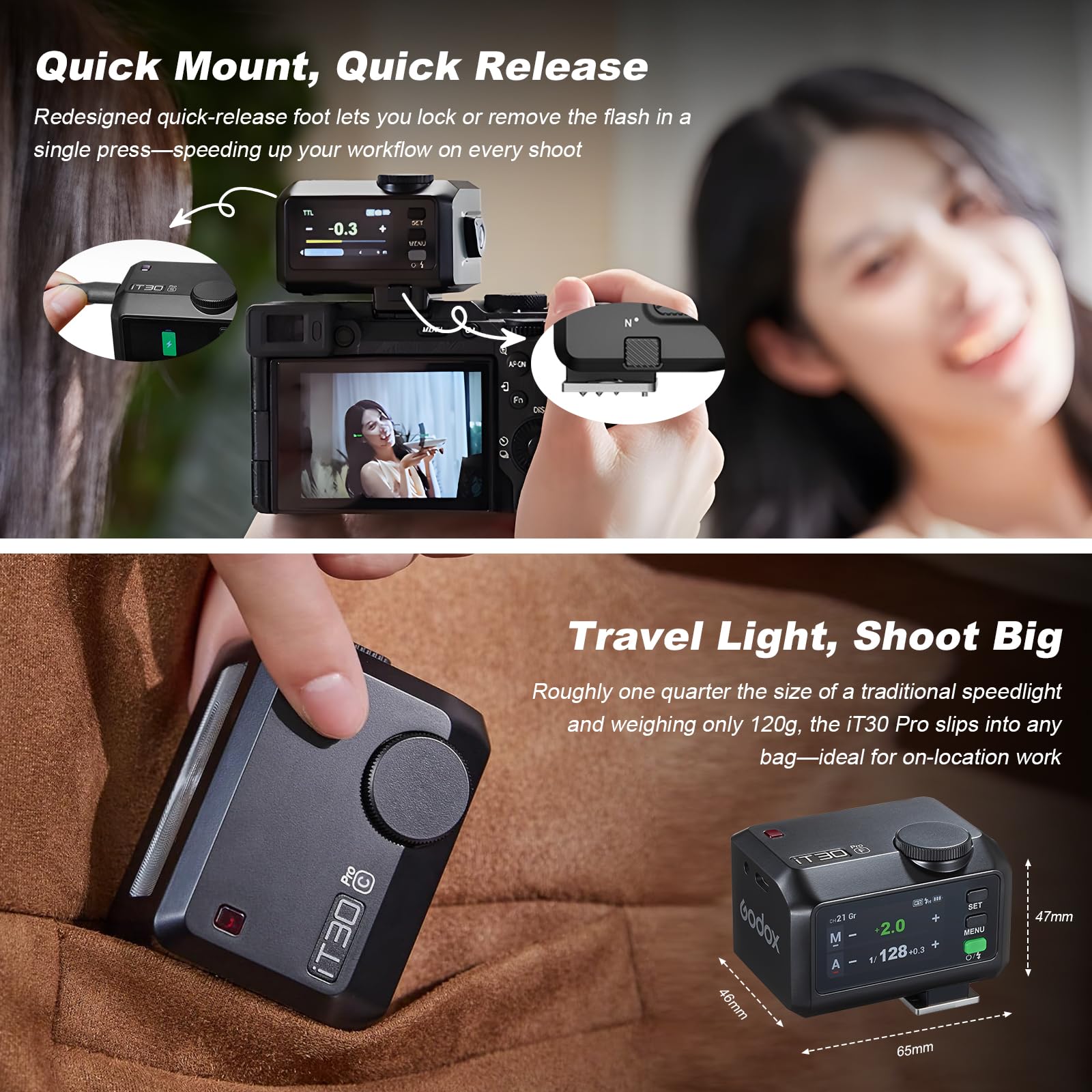 Hey, falls du nach einem praktischen Blitz für deine Fuji-Kamera suchst - der Godox iT30Pro-F ist echt einen Blick wert! Der kleine Kerl hat nämlich einiges drauf: Mit dem 2.4G Wireless-System kannst du mehrere Blitze gleichzeitig steuern, ohne lästige Kabel. TTL-Automatik macht's super einfach, auch für Einsteiger - einfach anschalten und losknipsen! Der Touchscreen reagiert mega smooth, und falls du Handschuhe trägst, geht's auch mit den klassischen Tasten. Praktisch: Der eingebaute Diffusor macht das Licht schön weich, und mit 1,5 Sekunden Recyclingzeit verpasst du keine Momente. 560 Blitze bei voller Leistung sind mehr als genug für längere Shootings. Aufladen per USB-C? Kein Problem, sogar mit Powerbank unterwegs. Ob im Studio oder Outdoor - der 120g leichte Blitz ist immer dabei!