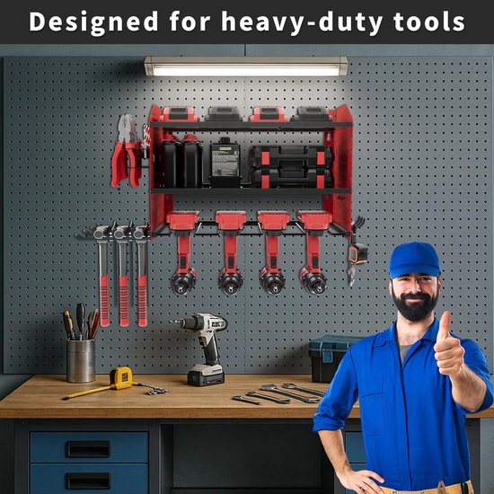 Endlich Ordnung in der Werkstatt! Diese 4-ebige Werkzeug-Wandhalterung aus Metall bringt System in dein Chaos. Mit Platz für bis zu 8 Schlagbohrer oder Akkuschrauber und zusätzlichen Haken für Schraubendreher und Zangen hast du alle wichtigen Werkzeuge immer griffbereit. Die Maße von 81x42x20cm (zusammengeklappt) bieten viel Stauraum ohne viel Platz zu beanspruchen. Die solide Metallkonstruktion ist hitzebeständig, wasserfest und super stabil - da halten auch schwere Werkzeuge problemlos. Die Montage ist total einfach, alle nötigen Teile und eine Anleitung sind dabei. So hast du deine wertvollen Werkzeuge nicht nur ordentlich verstaut, sondern auch vor Beschädigungen geschützt. Perfekt für Garage, Werkstatt oder Hobbykeller. Einfach an die Wand montieren und sich über die aufgeräumte Werkstatt freuen!