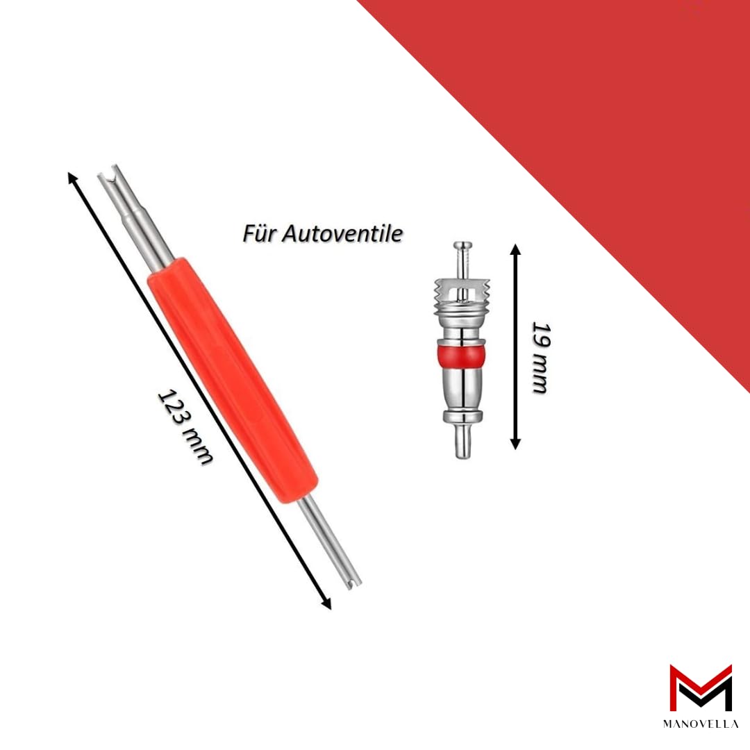 Dieser Ventilausdreher macht den Ventilwechsel zum Kinderspiel! Doppelseitig für einfaches Ein- und Ausdrehen von Ventileinsätzen. Kompatibel mit TR412, TR413, TR414, TR418 und anderen gängigen Ventiltypen.\\n\\nMit 123mm Länge super kompakt für unterwegs. Edelstahl-Spitzen für Präzision, ergonomischer Kunststoffgriff für sicheren Halt. Inklusive 5 Ventileinsätzen als Ersatzteile.\\n\\nPerfekt für Autos, Motorräder, Roller, Rasenmäher und mehr. Ein Muss in jeder Werkzeugtasche oder Garage. Einfach zu bedienen - selbst für Anfänger. Mach dich unabhängig von der Werkstatt und wechsle deine Ventile selbst. Qualität, die sich lohnt!