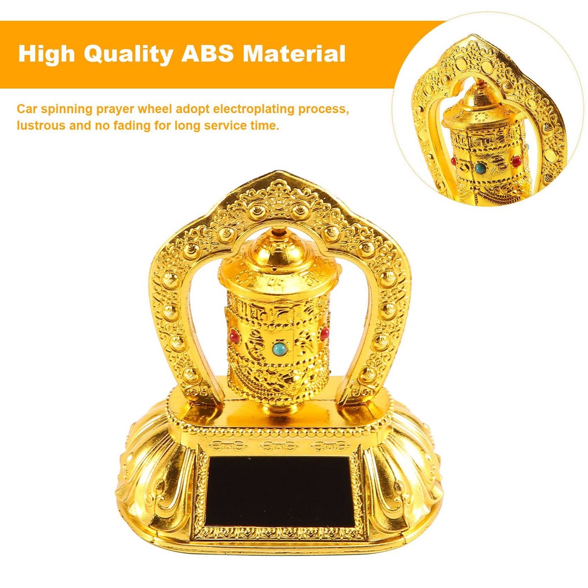 Besondere Atmosphäre für Auto oder Zuhause! Dieses tibetische Gebetsrad in Gold-Optik wird von Solar betrieben und dreht sich, sobald Licht darauf fällt. Aus hochwertigem ABS-Kunststoff mit galvanisierter Oberfläche, die nicht verblasst. Ein spirituelles Accessoire, das Ruhe und positive Energie verbreitet. Einfach aufs Armaturenbrett stellen oder ins Regal - und schon wird dein Raum zum besonderen Ort. Auch ein tolles Geschenk für spirituell interessierte Freunde!