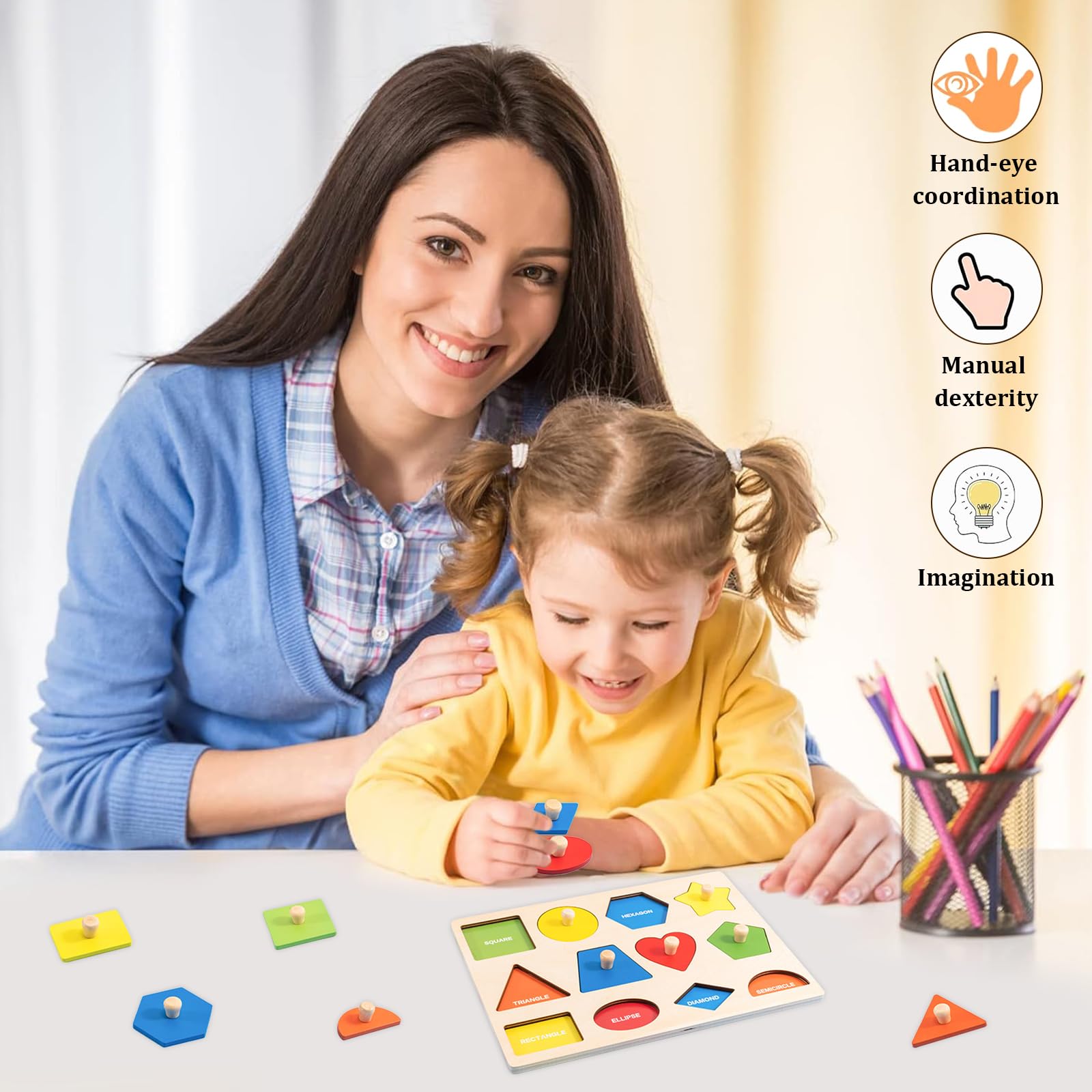 So macht Lernen Spaß! Dieses süße Steckpuzzle aus Holz ist perfekt für kleine Entdecker ab 1 Jahr. Mit 12 bunten Formen und praktischen Knaufgriffen - super einfach für kleine Hände zu greifen. Fördert spielerisch die Motorik, Hand-Auge-Koordination und das Erkennen von Farben und Formen. Aus ökologischem Holz mit wasserbasierter Farbe - absolut sicher und ungiftig. Die Teile sind griffig und passen perfekt in die Löcher. Ein tolles Montessori-Spielzeug für zu Hause oder Kindergarten. Perfekt als Geschenk für Kleinkinder - edukativ und macht riesig Spaß! Dein Baby wird stundenlang beschäftigt sein und dabei ganz viel lernen.