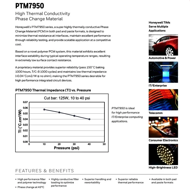 Extreme Kühlung für deine High-End Hardware! Das PTM 7950 Wärmeleitpad bietet mit 8,5 W/mK eine außergewöhnliche Wärmeleitfähigkeit und übertrifft damit viele herkömmliche Wärmeleitpasten. Mit weniger als 0,04°Ccm²/W thermischem Widerstand sorgt es für optimale Wärmeableitung von CPU und GPU.