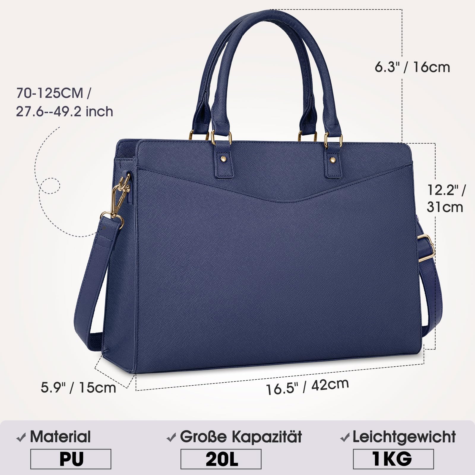 Diese Laptoptasche ist einfach der Hammer! Nicht nur, dass sie deinen 15,6 Zoll Laptop sicher verstaut - sie kommt auch noch mit einer praktischen Kosmetiktasche und einer schicken Clutch daher. Aus robustem Segeltuch mit edlen Leder-Applikationen gefertigt, sieht sie einfach klasse aus. Das separate Laptopfach schützt deinen Computer optimal, während in den vielen Innentaschen all deine anderen Sachen Platz finden: Handy, Geldbörse, Schlüssel, Make-up - alles hat seinen festen Platz. Die goldenen Details und der hochwertige Reißverschluss geben der Tasche das gewisse Etwas. Besonders praktisch: Die Tasche kann aufrecht stehen bleiben und hat außen noch eine Tasche für deine Wasserflasche oder den Regenschirm. Der verstellbare Ledergriff macht das Tragen super bequem, egal ob in der Hand oder über der Schulter. Perfekt fürs Büro, für Meetings, Geschäftsreisen oder einfach für unterwegs. Mit diesem Set bist du immer bestens ausgestattet und siehst dabei noch richtig gut aus! • Inklusive Kosmetiktasche und Clutch • Separate Laptopfach für 15,6 Zoll • Robustes Segeltuch mit Lederdetails • Mehrere Innentaschen und Fächer • Verstellbarer Ledergriff • Kann aufrecht stehen • Vielseitig einsetzbar