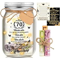 Das perfekte Geschenk zum 70. Geburtstag für Mama, Oma, Schwester oder Freundin! Dieses bezaubernde LED-Flaschenlicht mit dem Spruch 'HAPPY 70th BIRTHDAY, Die Welt Ist Schön Weil Du Mit Drauf Bist' schafft eine wundervolle Atmosphäre. Das warme Licht macht jeden Raum gemütlich und romantisch. Im Lieferumfang: Glasflasche mit Aufdruck, LED-Verschluss, Leinenschnur, Herz-Anhänger und 3 Batterien. Perfekt fürs Wohnzimmer, Bücherregal oder als Tischdekoration. Ein wirklich durchdachtes Geschenk das von Herzen kommt und bleibende Erinnerungen schafft. Zeig deine Wertschätzung mit diesem einzigartigen Geburtstagsgeschenk!
