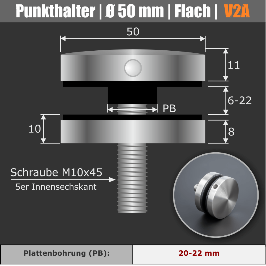 Brauchst du eine stabile Halterung für dein Glasvordach? Dieser Punkthalter aus massivem Edelstahl V2A (AISI 304) ist genau das Richtige! Mit flachem Anschluss für einfache Montage an glatten Flächen. Die Oberfläche ist fein gebürstet (Korn 240) und sieht nicht nur professionell aus, sondern ist auch langlebig. Perfekt für Glasvordächer, Treppengeländer oder Glaswände. Wählbar in verschiedenen Größen - hier im Beispiel 30mm. Kommt neu in OVP und luftfolienverpackt. Ein robustes Teil, das dein Glas sicher hält und dabei noch gut aussieht. Einfach montieren und von der stabilen Qualität überzeugt sein!