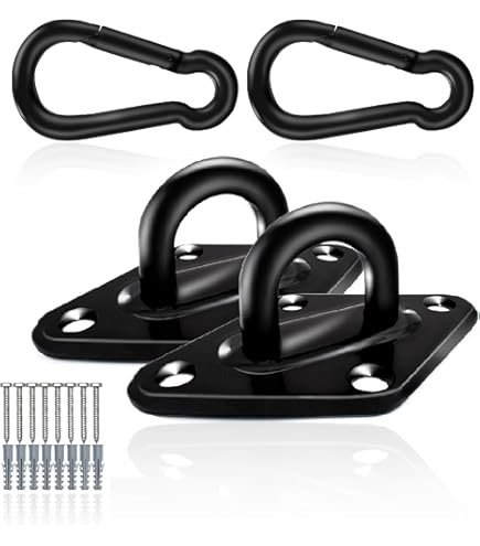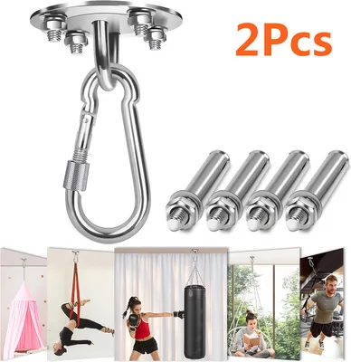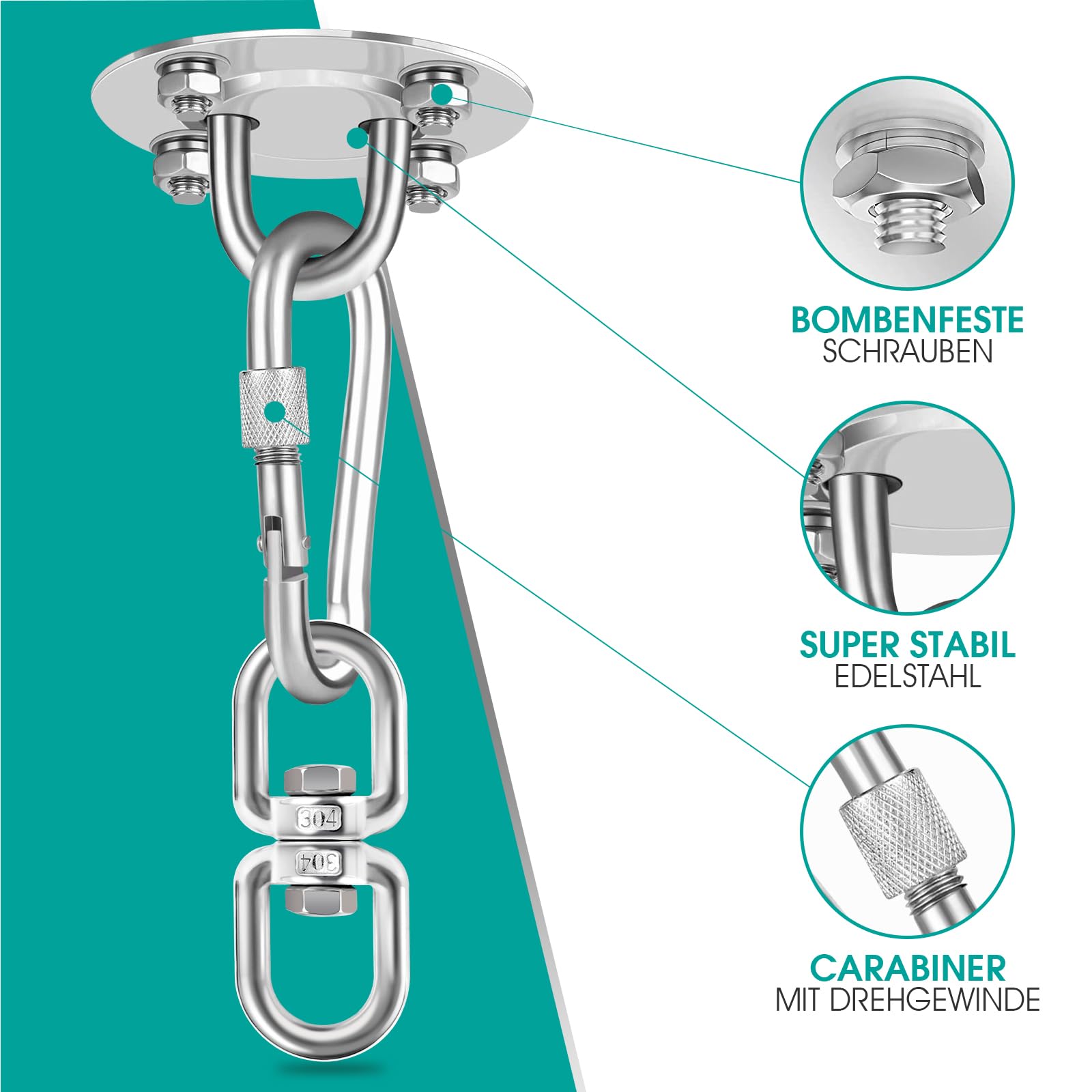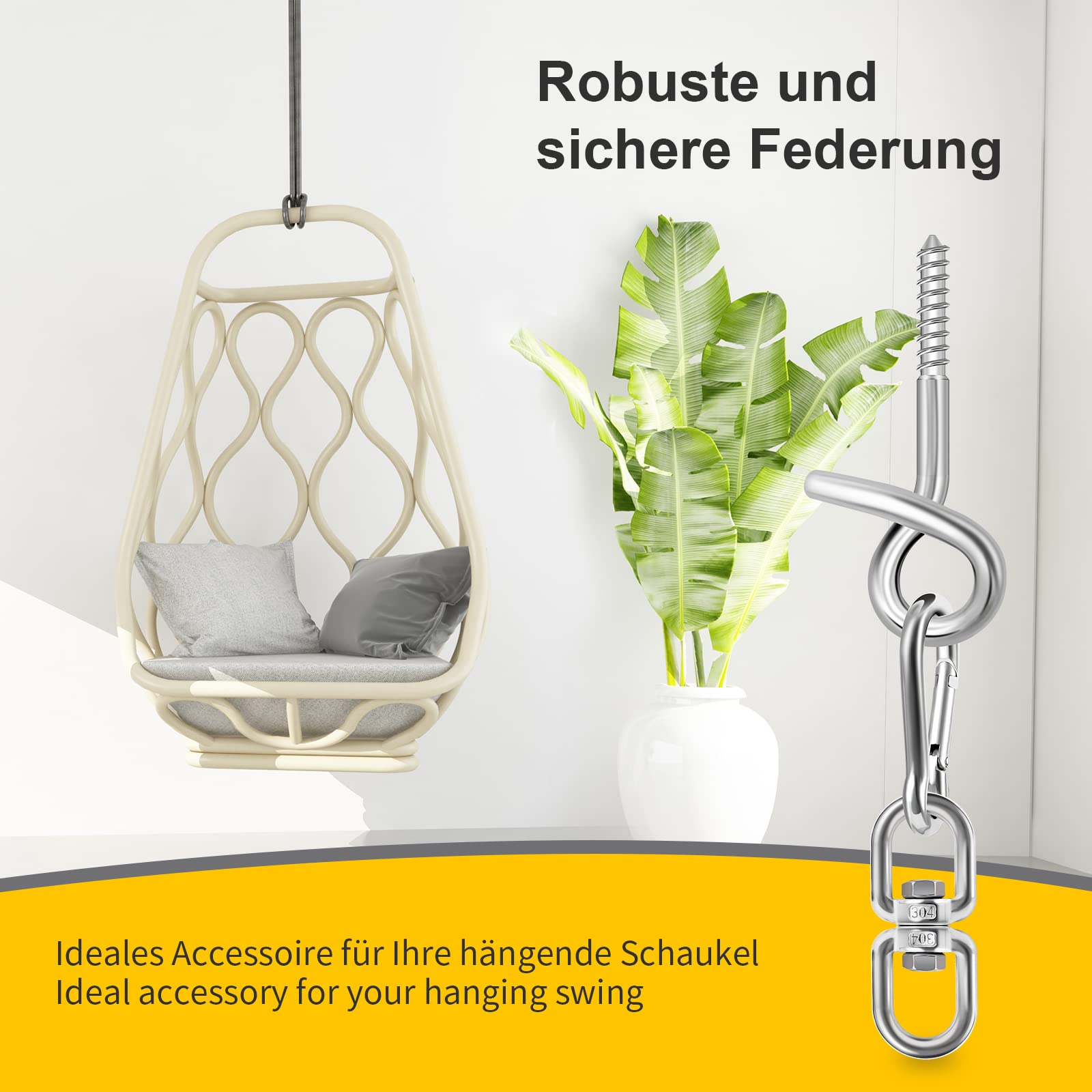 Safe Hängesessel-Aufhängung gefällig? Dieses 2er Set Deckenhaken hält bis zu 200kg aus! Aus wetterfestem verzinktem Stahl - super robust und langlebig. Im Set: 2x M10 Schraubhaken, 2x Karabiner, 2x Wirbel. Einfache Montage in Deckenbalken, Stein oder Beton (Dübel inklusive!). Perfekt für Hängesessel, Hängematten, Schaukeln oder auch Boxsäcke. Der Wirbel sorgt für freie Drehung, nichts verheddert sich! Für innen und außen geeignet. Nur ein Bohrloch pro Haken nötig - schnell installiert, lange Freude! Endlich entspannt in deinem Hängesessel schaukeln - sicher und komfortabel!