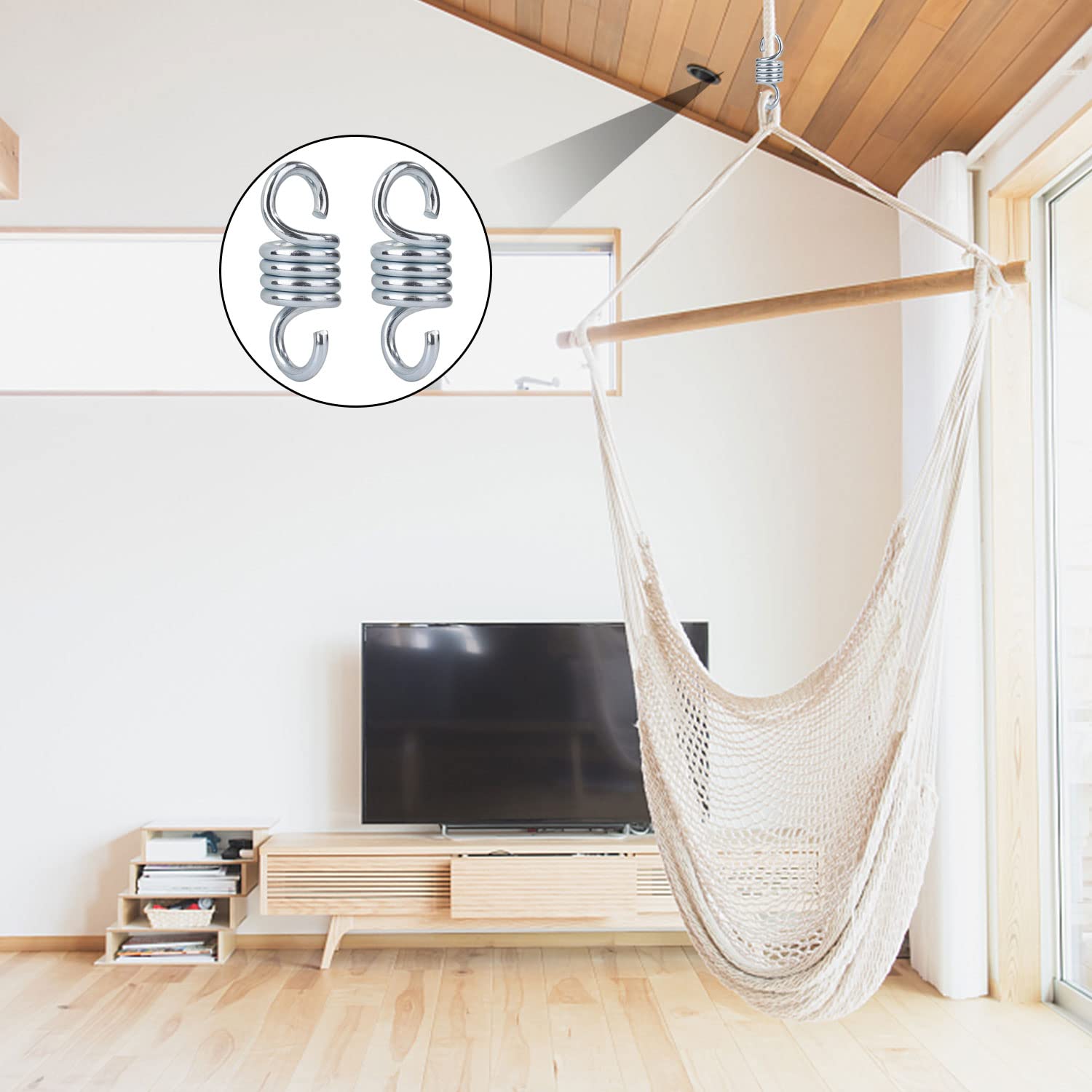 Mit ihren kompakten Maßen von 108 mm Länge und 39 mm Breite passen die Federn an fast jede Hängevorrichtung. Der Haken hat 7 mm Durchmesser und lässt sich super einfach einhaken. Ob Hollywoodschaukel, Hängesessel, Hängematte oder Sonnensegel - mit diesen Federn habt ihr immer eine sanfte Schwingbewegung und maximalen Komfort. Und das Beste: Jede Feder wiegt nur 195 Gramm! So leicht und doch so stabil.