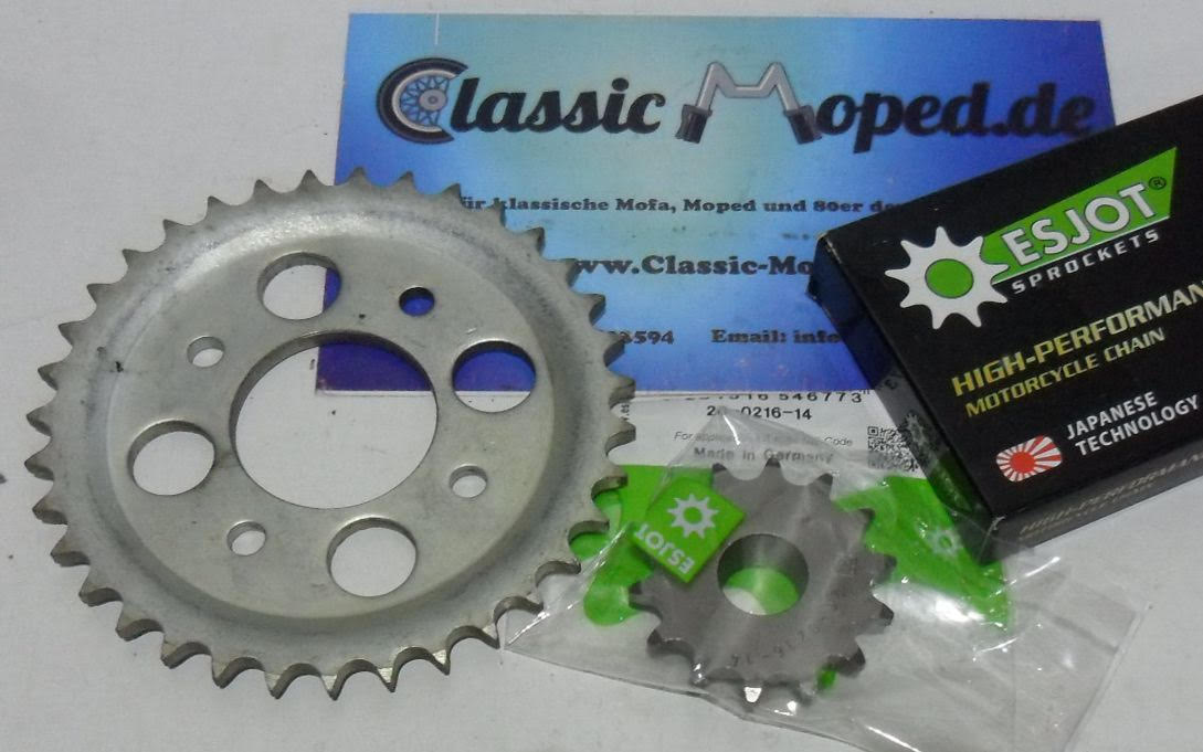 Achtung Hercules KX 5 Besitzer! Dieser 3-teilige Kettensatz in schwarz ist genau das was du brauchst für dein Moped! Mit 11 Zähnen am Ritzel und 35 Zähnen am Kettenrad - perfekt abgestimmt für deine Maschine! Die Kette hat 104 Glieder mit 415er Teilung (1/2 x 3/16) und ist extra verstärkt! Wichtig: Passt nur für Hercules KX 5 bis Motor Nummer 10697365! Achtung bei Änderung der Zähnezahl - das kann die Betriebserlaubnis erlöschen lassen! Die originalen OE-Nummern sind 0236108003 fürs Ritzel und 0890231002 fürs Kettenrad! Aus robustem Stahl gefertigt - hält was aus! Mit 2 Jahren Herstellergarantie! Oldtimer-Teil ja, aber kein Universaltteil! Kettenrad hat 5 Befestigungslöcher mit 7,5mm Durchmesser! Eventuell muss die Kette noch gekürzt werden! Hol dir das Set und mach dein Moped wieder fit für die Straße - aber pass mit den Zähnezahlen auf!