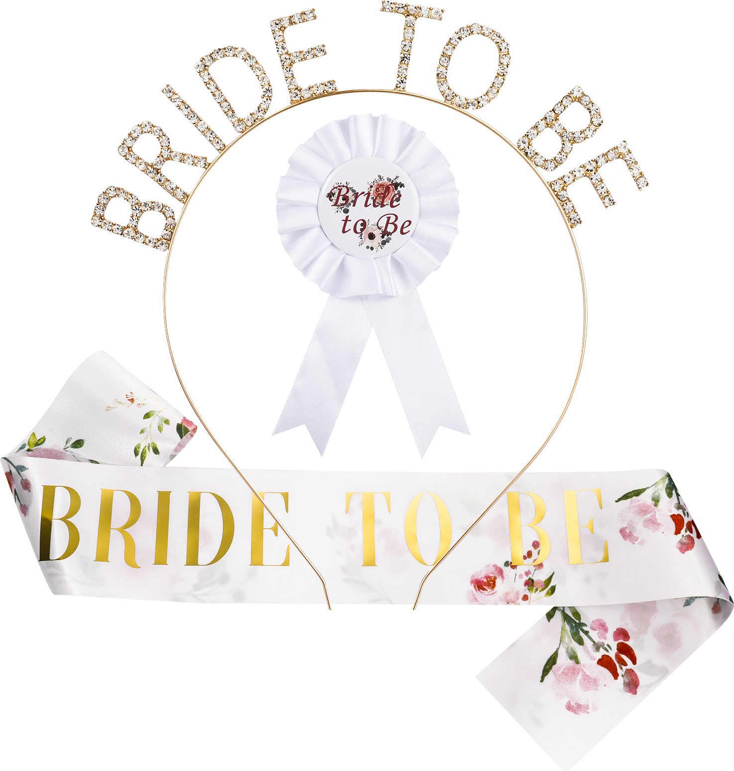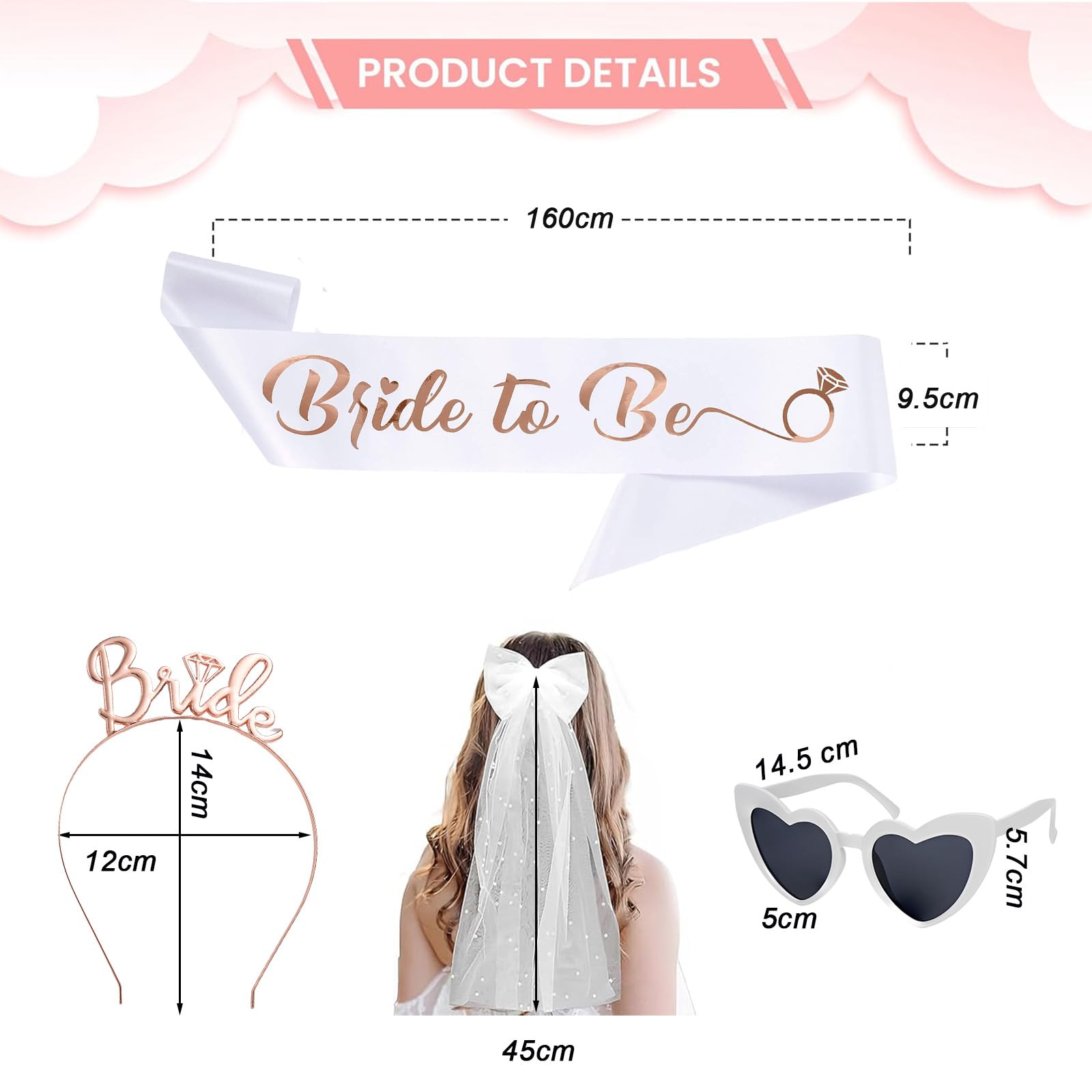 Perfekt für den Junggesellenabschied! Dieses 5-teilige Set macht die Braut zum Star. Enthalten: Ein langer, eleganter Schleier (82cm) mit Kamm, eine herzförmige Sonnenbrille mit Perlen, ein funkelndes Perlen-Kopfband mit 'Bride'-Aufschrift, eine 'Bride to Be'-Schärpe aus Satin und temporäre Gold-Tattoos für die ganze Mädelsgruppe. Alles in edlem Weiß und Gold gehalten. Einfach anzulegen und super für Fotos. Ideal für die Brautdusche, Verlobungsfeier oder als Requisiten für die Hochzeitsfotografie. Mach den Tag der Braut unvergesslich - mit Style und jeder Menge Spaß!