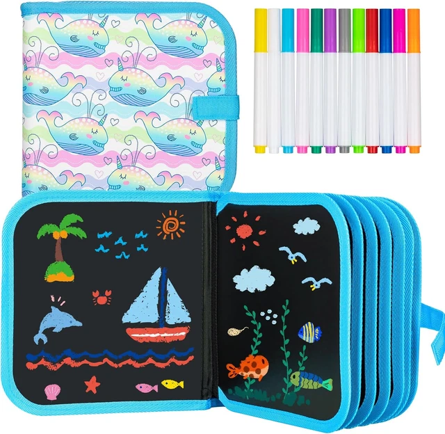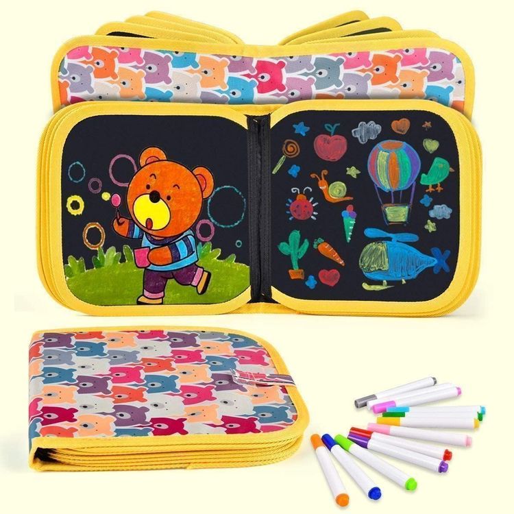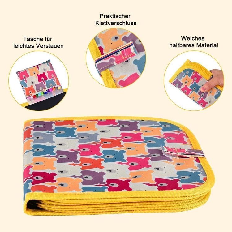 Total praktisch für kleine Künstler! Dieses tragbare Zeichenbrett im 20x20cm Format hat 16 Seiten die immer wieder verwendbar sind. Einfach mit den 12 wasserbasierten Stiften drauf los malen und bei Bedarnf mit einem feuchten Tuch abwischen - wie von Zauberhand! Aus weichem Oxford-Stoff und wasserdichtem PP-Material, komplett ungiftig und mit abgerundeten Ecken für maximale Sicherheit. Die spezielle Pinseltasche verhindert das Verlieren der Stifte. Perfekt für unterwegs im Auto, Restaurant oder Urlaub. Fördert Kreativität, Feinmotorik und macht obendrein noch Spaß ohne Ende. Ideal für Kinder von 3-8 Jahren. Ein super Geschenk für jeden Anlass - die Eltern werden's dir danken, weil keine Zettelwirtschaft mehr!