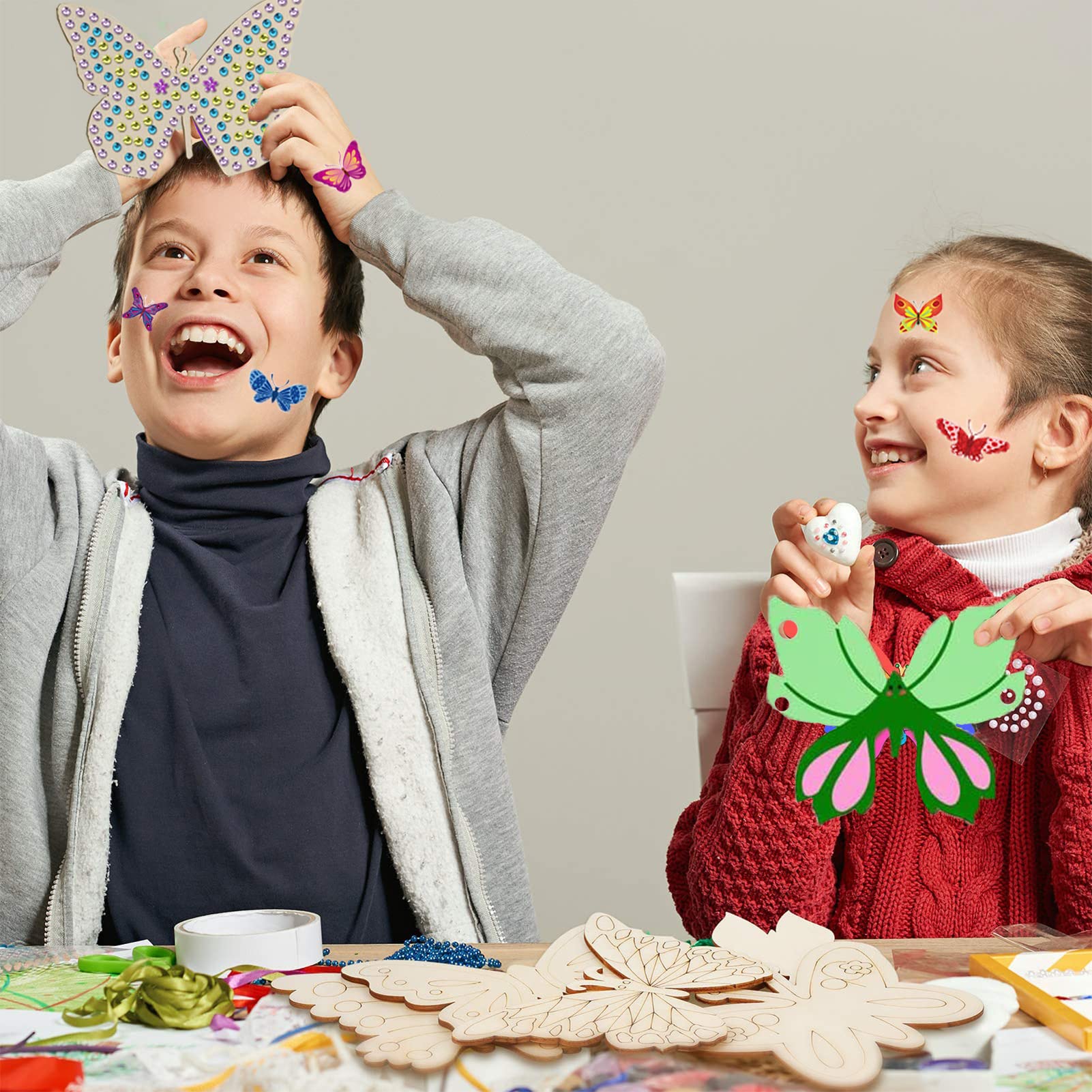 Mama, Papa, Oma, Opa - aufgepasst! Dieses Bastelset von Guilinone ist der absolute Hit für kleine Künstler ab 4 Jahren. Mit 52 Teilen ist hier für jede Menge Bastelspaß gesorgt!\n\nWas alles im Set dabei ist? 12 Holzschmetterlinge, 12 Holzblumen mit fünf Blättern, 12 Blumen mit sechs Blättern, 4 glitzernde Kristallaufkleber, 12 bunte Aquarellstifte und ein Bündel Dekoseil. Also wirklich alles, was kleine Hände zum kreativ werden brauchen.\n\nDas Holz ist super glatt geschliffen - keine Sorge vor Splittern! Die Figuren lassen sich leicht bemalen und die Farben verblassen nicht. Perfekt also, um tolle Anhänger fürs Kinderzimmer oder Geschenke für die Großeltern zu gestalten.\n\nWarum das Set so toll ist? Es fördert nicht nur die Kreativität, sondern auch die Feinmotorik und Konzentration der Kleinen. Und das ganz ohne Elektronik - einfach mal analoger Spaß!\n\nSuper geeignet für Kindergeburtstage, verregnete Nachmittage oder als Beschäftigungsidee für die Ferien. Die Kinder können gemeinsam basteln, sich austauschen und ihre kleinen Kunstwerke mit nach Hause nehmen.\n\nKleiner Tipp: Nicht für Kinder unter 3 Jahren geeignet wegen verschluckbarer Kleinteile. Aber für die Größeren ein absolutes Must-have für die Spielzeugkiste!