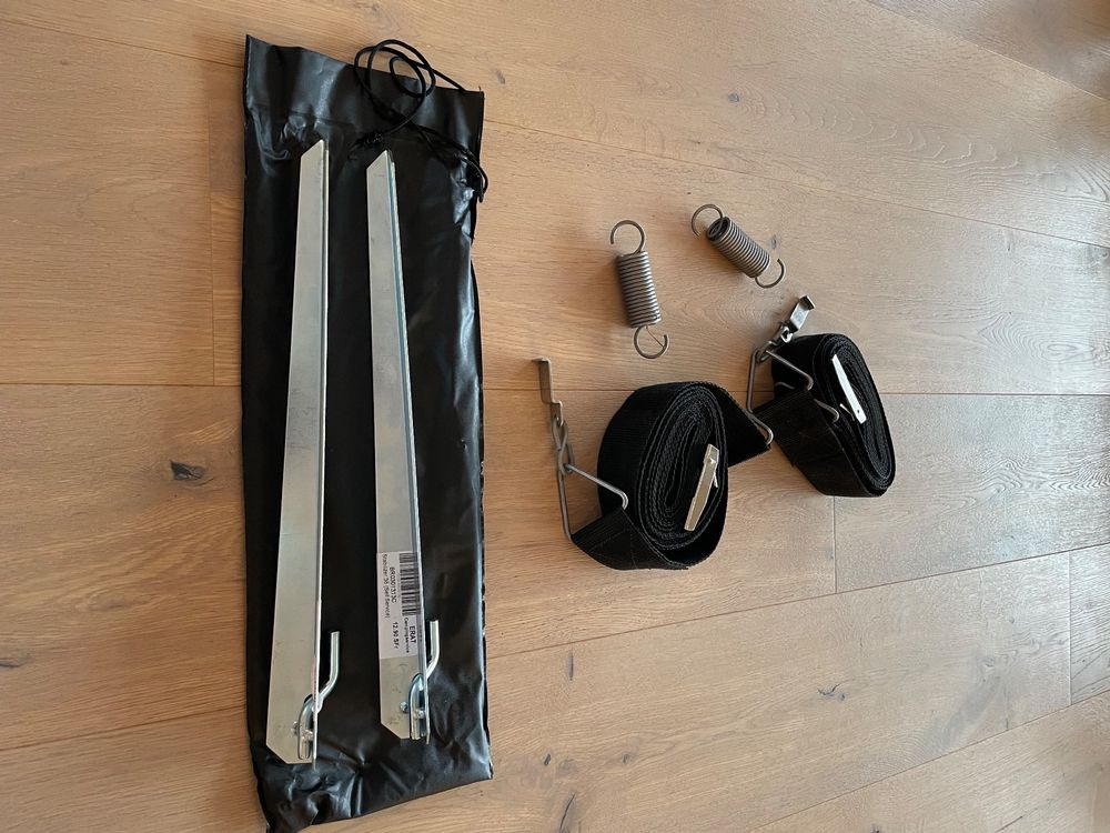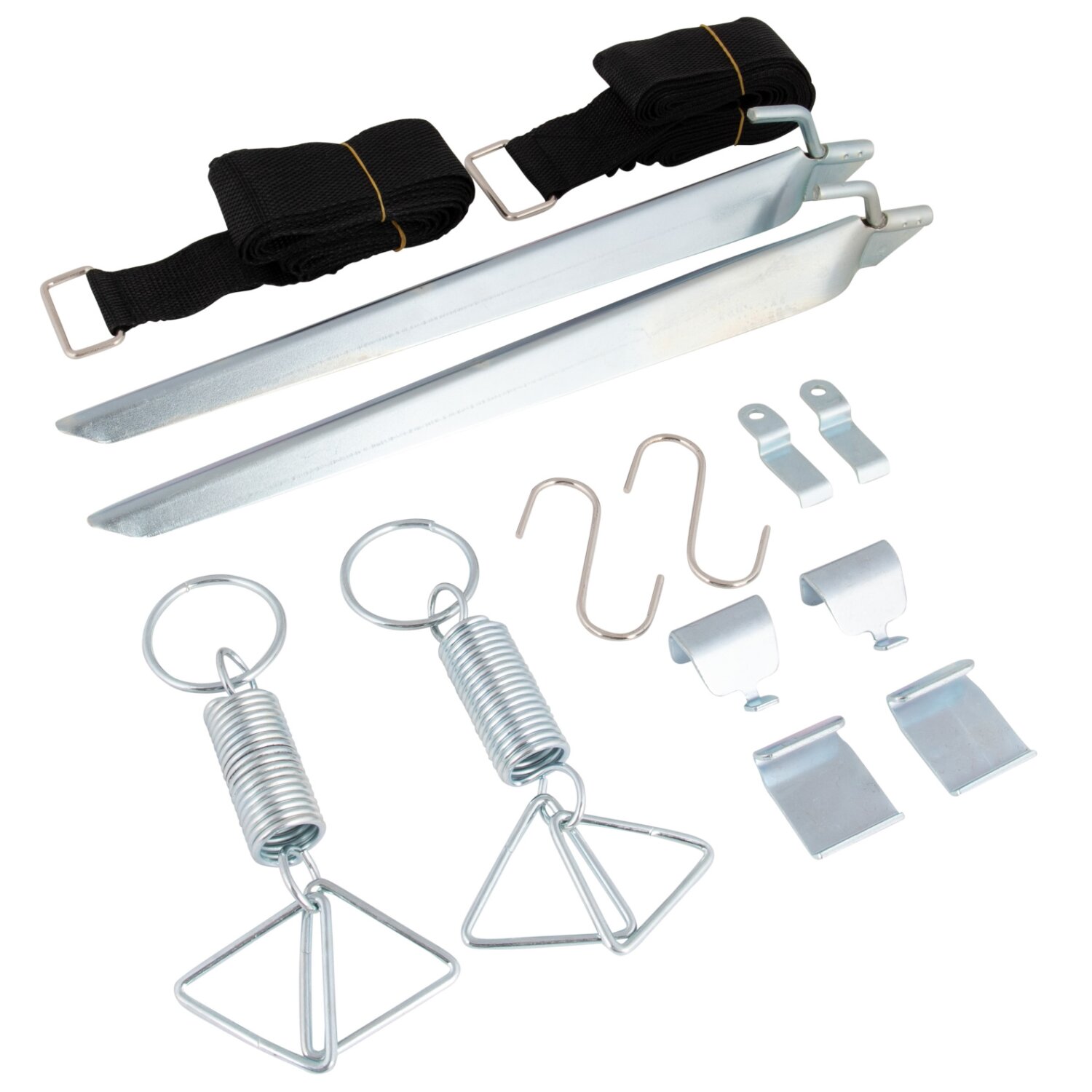 Schütze deine Markise vor Wind und Wetter! Dieses komplette Sturmband-Set sorgt für Stabilität auch bei starkem Wind. Enthalten sind 2 Spiralerdspieße, 2 Stoßdämpferfedern und 2 Spanngurte - alles sicher verpackt in einer praktischen Tasche.
