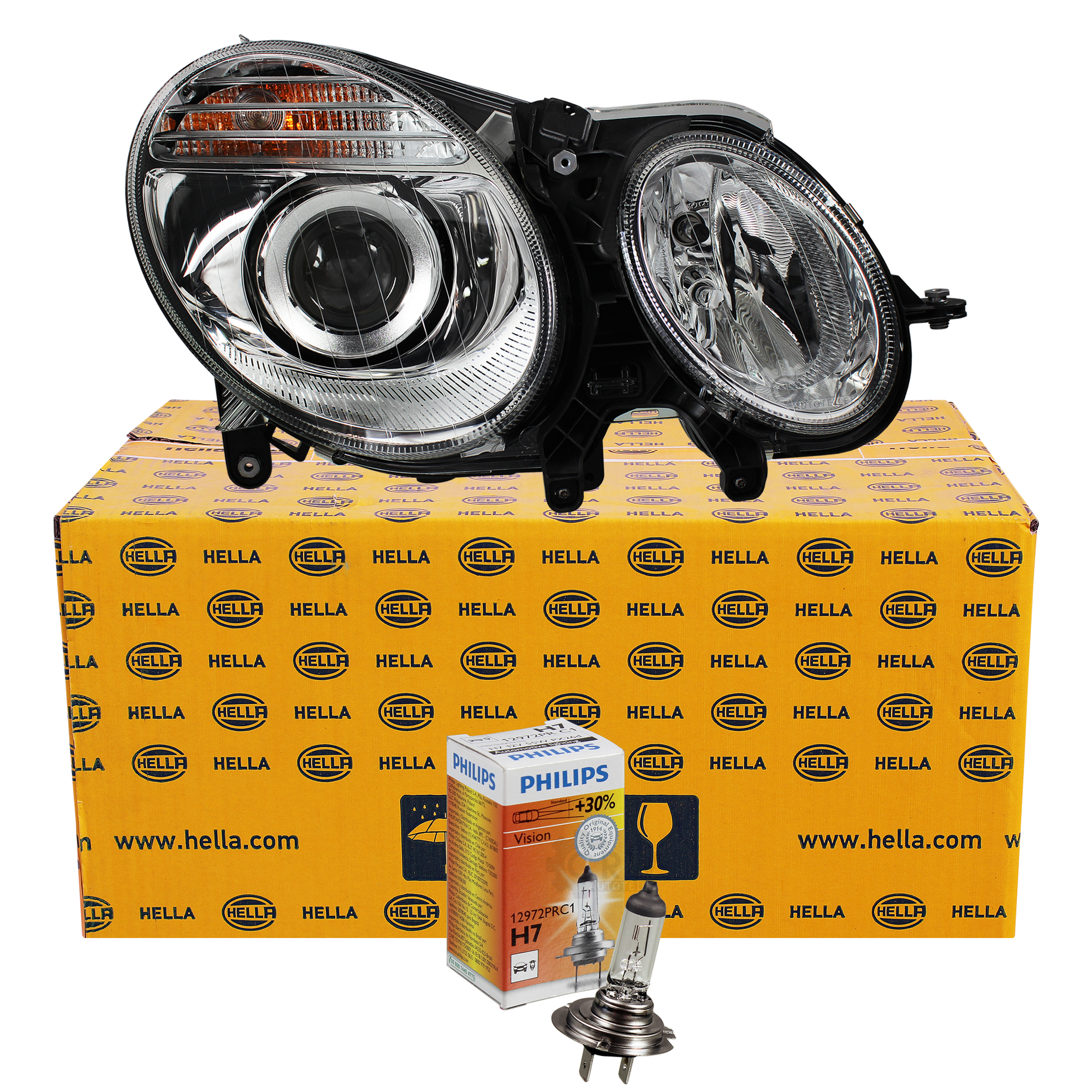 Original HELLA Scheinwerfer für deine Mercedes E-Klasse (W213)! Speziell für Rechtsverkehr - rechte Seite. Mit Tagfahrlicht (LED), Fernlicht, Abblendlicht und Blinklicht.\\n\\nTechnologie: Halogen mit PY21W/H7/H7 Lampen. Ohne Mercedes-Schriftzug, aber mit Stellmotor für Leuchtweitenregulierung. Paarige Artikelnummer: 1EG 012 076-051.\\n\\nHELLA Qualität vom Erstausrüster - langlebig, sicher und komfortabel. Einfache Installation, perfekte Passform. Prüfe vor dem Kauf die genaue Fahrzeugzuordnung. Mach deine E-Klasse wieder straßensicher mit diesem hochwertigen Ersatzscheinwerfer!