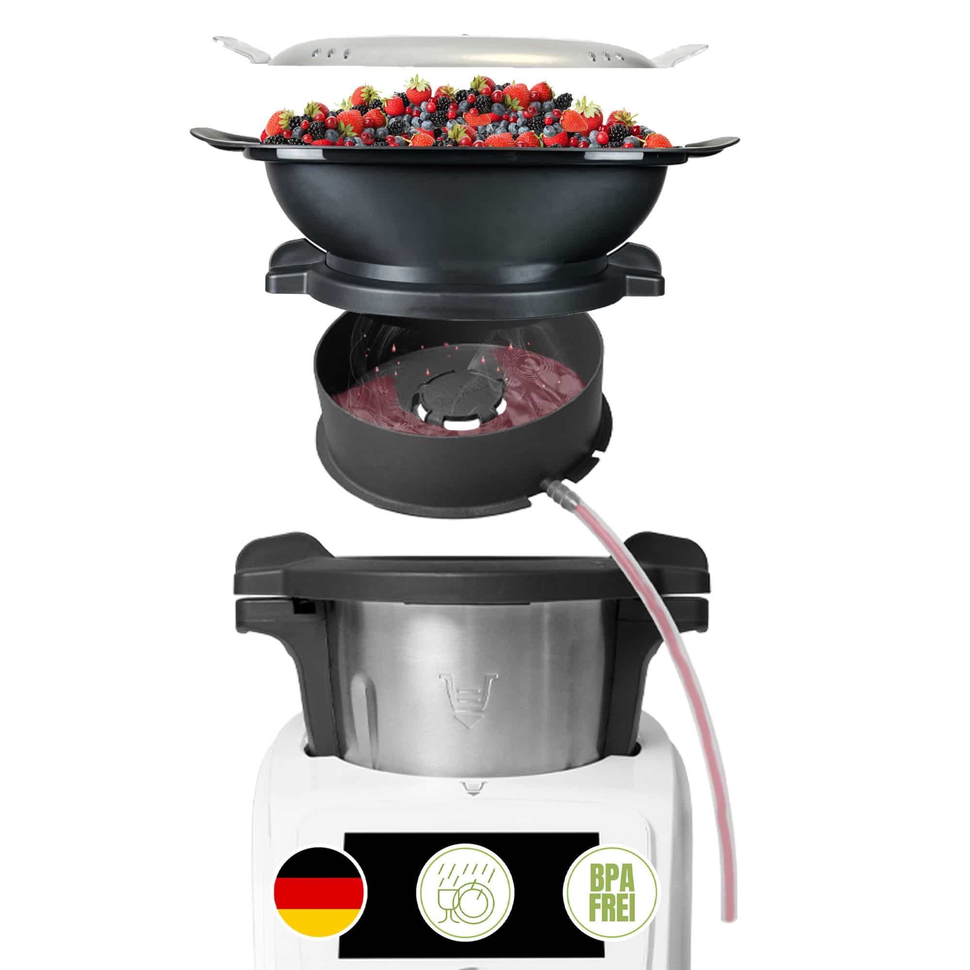 Hey, dieser Spritzschutz ist ein echter Game-Changer für deine Küchenmaschine! Ob Monsieur Cuisine Connect, Smart oder Thermomix TM6, TM5, TM31 - der passt einfach auf alles. Aus lebensmittelechtem Silikon, also absolut unbedenklich und hitzebeständig.\n\nKein lästiges Putzen mehr nach dem Kochen! Die kleinen Löcher lassen den Dampf raus, aber halten Flüssigkeit und Fettspritzer zuverlässig drin. Einfach auf den Deckel stecken und schon kann's losgehen.\n\nAber Achtung: Wenn's mal richtig dampft und kocht, nicht direkt an die Tülle fassen - Verbrennungsgefahr! Ansonsten ist das Teil absolut unkompliziert.\n\nWenn dein alter Spritzschutz kaputt ist oder du einfach mal was Neues brauchst - hier bist du genau richtig. Qualitativ hochwertig, passt perfekt und macht was es soll. Einfach geniales Küchenzubehör!