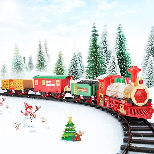 Alter, dieser schwebende Weihnachtszug bringt richtig Weihnachtsstimmung in dein Zuhause! Mit Lokomotive die tutet, tuckernde Motorgeräusche macht und Scheinwerfer hat, plus drei passende Waggons. Die Gleise werden zu nem Kreis mit 89cm Durchmesser zusammgebaut - perfekt für die meisten Weihnachtsbäume. Empfohlen für Bäume von 1,5-2,3m Höhe mit Stammdurchmessern von 2,4-5,7cm. Kann auch einfach auf dem Boden unter dem Baum fahren. Einfach 2 AA Batterien rein (nicht im Lieferumfang) und schon geht der Spaß los! Im Set: 1 Lok, 3 Waggons, 8 Schienen, 8 Stützen und ne Halterung für den Baum. Maße: 80cm Durchmesser, Lok: 18x6x5cm. Aus Kunststoff, aber richtig stabil. Macht besonders Kindern ne Riesenfreude!