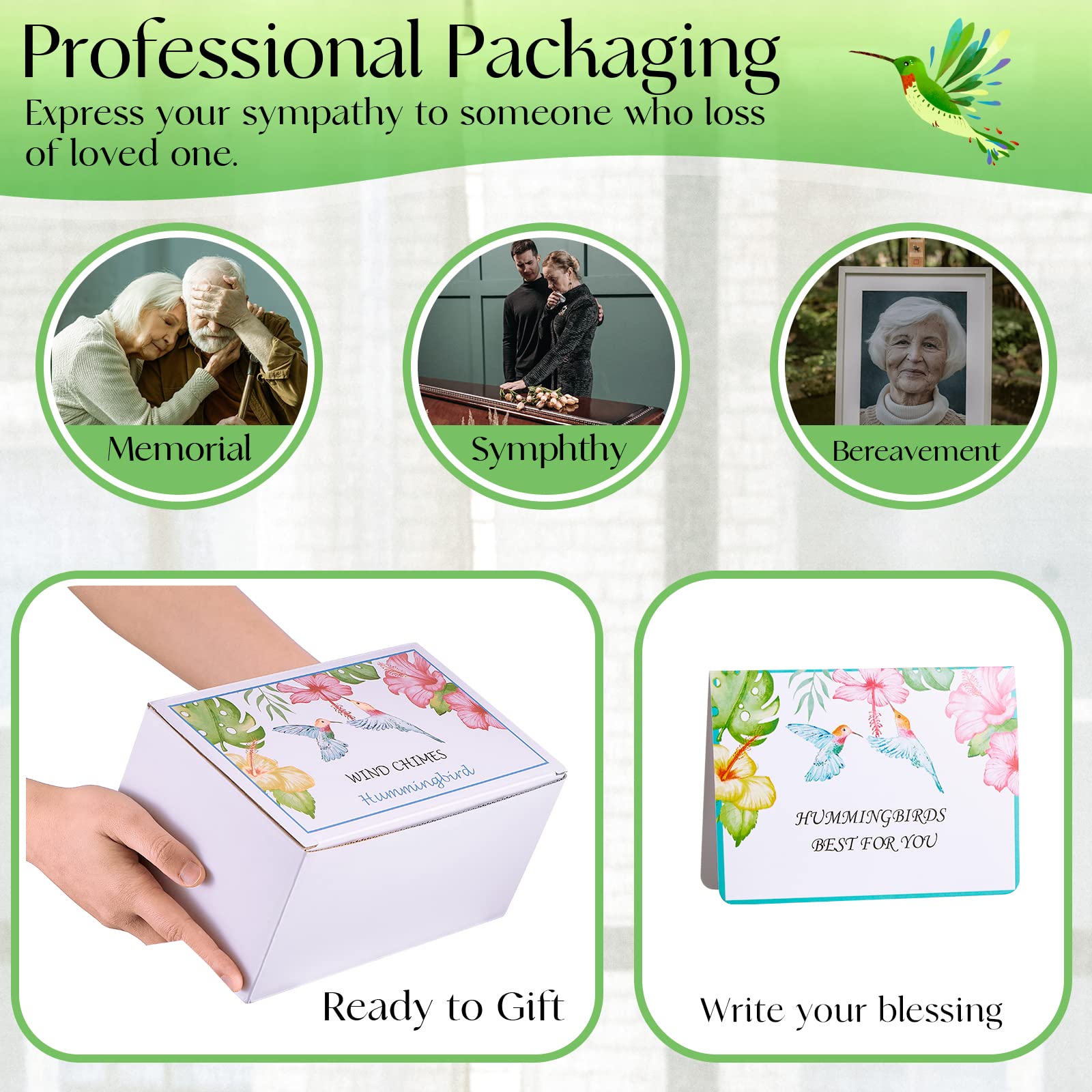Wenn Worte nicht ausreichen... Dieses zarte Kolibri-Windspil ist das perfekte Beileidsgeschenk für trauernde Menschen. Kolibris gelten als Boten aus dem Jenseits und bringen Trost in schweren Zeiten. Das Windspiel erzeugt sanfte, beruhigende Klänge die beim Verarbeiten des Verlusts helfen können. Inklusive wunderschöner Beileidskarte mit dem Spruch 'Life touches others, life lives on' - auf der Rückseite kannst du eine persönliche Nachricht hinterlassen. Die boho-mäßige Dekoration mit Holzperlen passt in jeden Garten, Balkon oder Wohnzimmer. Ein sinnvolleres Geschenk als Blumen, das lange in Erinnerung bleibt. Für alle, die jemandem in traurigen Zeiten zeigen wollen: Du denkst an sie!