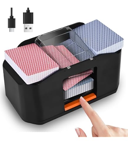 Schluss mit mühsamem Kartenmischen! Dieser automatische Kartenmischer erledigt die Arbeit für dich - einfach Knopf drücken und in Sekunden sind 1-2 Kartendecks perfekt gemischt. Super kompatibel mit allen gängigen Kartenspielen wie UNO, Poker, Skyjo, Skip BO und vielen mehr. Das kompakte schwarze Design ist platzsparend und sieht dabei noch stylisch aus. Perfekt für Spieleabende, Poker-Runden oder wenn du einfach keine Lust hast, selbst zu mischen. Die praktischen Einschubfächer machen die Bedienung kinderleicht und die robuste Bauweise mit Führungsschienen sorgt für zuverlässiges Mischen ohne Karten zu beschädigen. Einfach Strom anschließen, Karten einlegen, Knopf drücken und sich über perfekt gemischte Karten freuen! Ob für Spieleabende mit Freunden oder Turniere - dieses Teil ist ein echter Game-Changer!