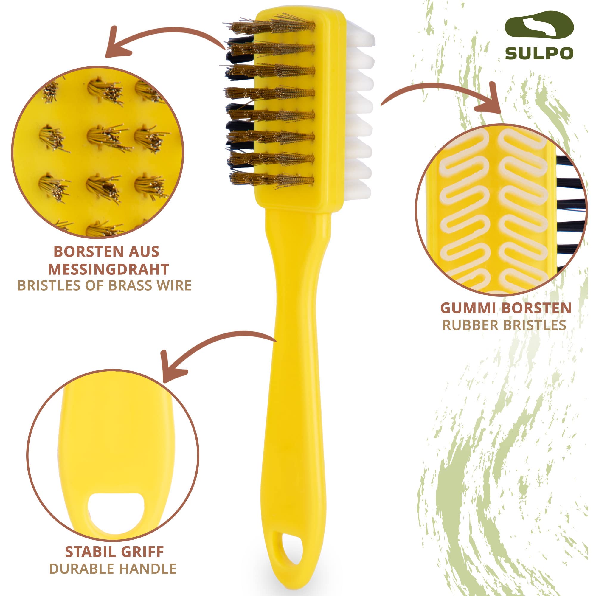 Perfekte Pflege für deine Wildlederschuhe! Diese 3-seitige Bürste von SULPO hat für jede Verschmutzung die richtige Borste: Messing für groben Schmutz, Nylon für normale Reinigung und Gummikrepp für empfindliche Stellen.\\n\\nDie kompakte Größe passt in jede Handtasche oder Reisekoffer - so hast du immer eine Bürste parat, wenn deine Schuhe mal wieder eine Auffrischung brauchen. Der griffige Kunststoffgriff liegt gut in der Hand.\\n\\nNicht nur für Schuhe geeignet: Auch Handtaschen, Jacken, Autositze oder Möbel aus Wildleder oder Nubuk lassen sich damit super reinigen. Ein echter Allrounder für die Pflege von empfindlichen Materialien!\\n\\n• 3-seitige Bürste für verschiedene Reinigungsstufen\\n• Borsten: Messing, Nylon, Gummikrepp\\n• Kompakt und reisefreundlich\\n• Für Wildleder, Nubuk, Rauleder\\n• Robuster Kunststoffgriff\\n• Vielseitig einsetzbar