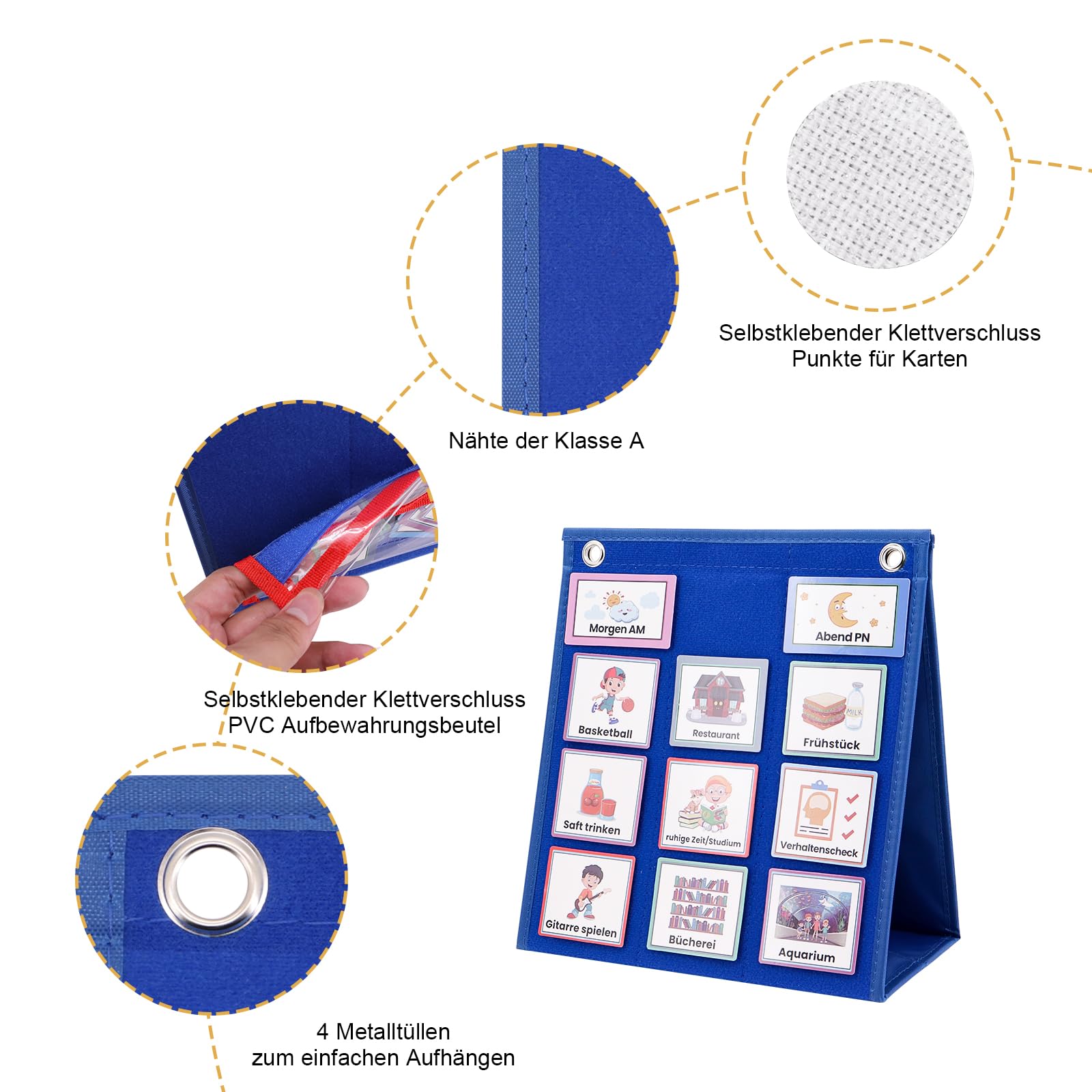 Perfekt für Vorschule, Kindergarten oder zu Hause! Dieses super praktische Filzboard hilft Kindern, ihren Tagesablauf zu verstehen und gibt ihnen Sicherheit durch Struktur. Mit 107x34 cm ist es groß genug, um alles Wichtige anzuzeigen, aber trotzdem handlich. Das Besondere: Es ist faltbar und kann sowohl an die Wand gehängt als auch auf den Tisch gestellt werden - je nachdem, was gerade besser passt. Die Enden haben Klettverschlüsse, sodass du es als Dreieck aufstellen kannst. Hergestellt aus leichtem Filz und Flanell, hält es lange und ist angenehm in der Handhabung. Im Lieferumfang sind eine Kartenaufbewahrungstasche, Klettaufkleber und 5 Blankokarten enthalten - du kannst also sofort loslegen! Ideal für Geschichtenerzählen, Gefühlsaktivitäten, Geburtstage, Weihnachten oder einfach als täglicher Kalender. Damit lernen Kinder spielerisch, ihren Tag zu planen, Wörter zu bilden oder Matheaufgaben zu lösen. Ein richtig vielseitiges Lernmittel, das nicht nur den Kleinen Spaß macht, sondern auch den Alltag erleichtert!