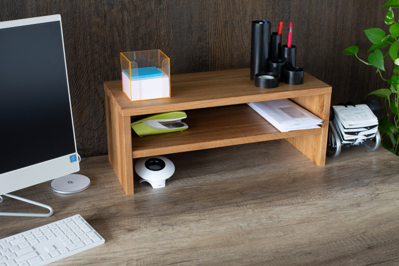 Das Regal aus massivem Holz in schicker Holzoptik ist 40cm breit und bietet reichlich Stauraum. Die Höhe der Fächer lässt sich anpassen, und du kannst es sogar unter dem Tisch montieren - total flexibel!