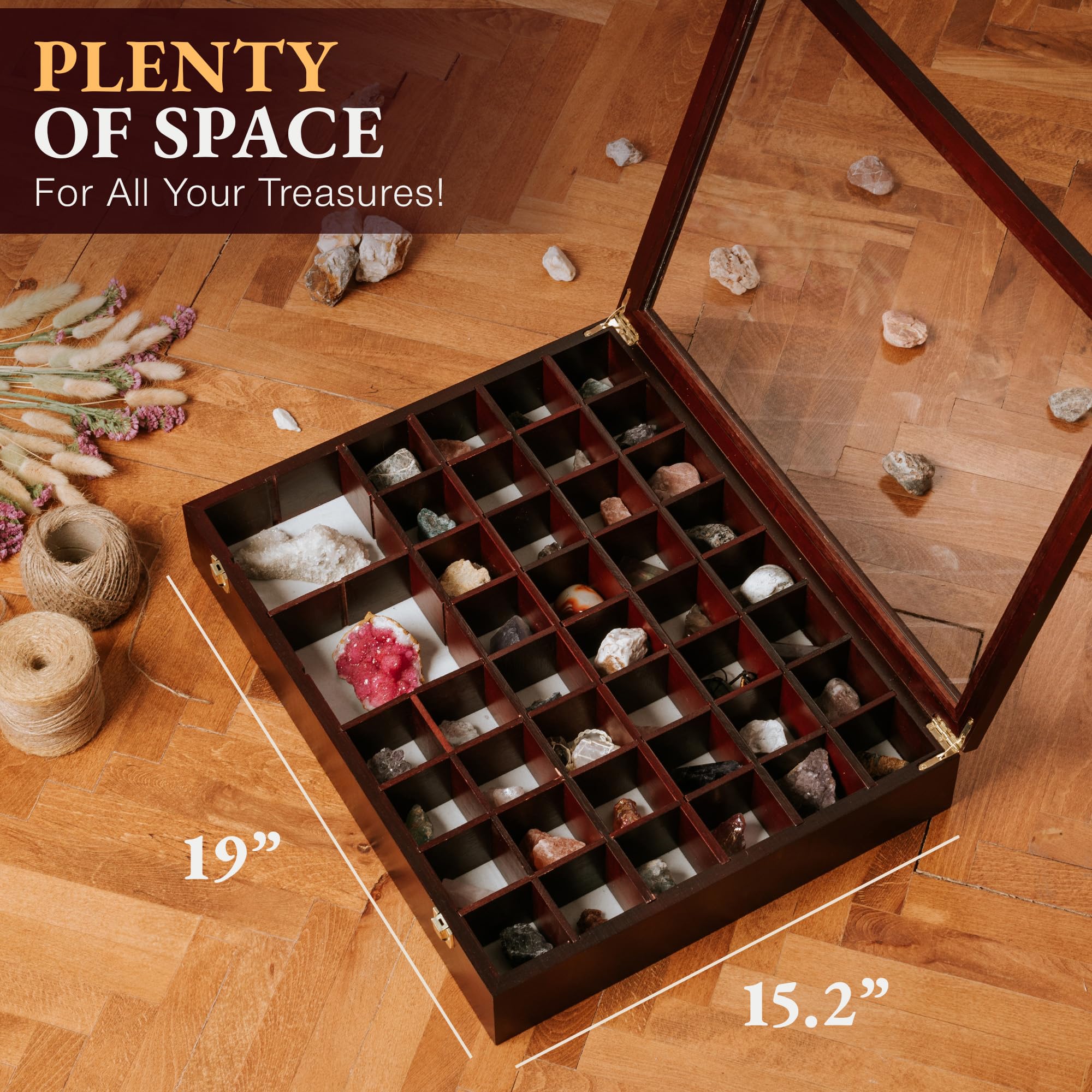 Endlich Ordnung in deiner Sammlung! Diese hübsche 24-Fach Vitrine aus massivem Holz ist perfekt für Edelsteine, Fossilien, Kristalle und anderen kleinen Schätzen. Mit den Maßen 20x15x5cm und 3x3cm großen Fächern findest du alles sofort wieder. Der klare Glasdeckel lässt deine Schätze perfekt zur Geltung kommen, während der samtweiche Innenfach sie vor Kratzern schützt. Der stabile Metallverschluss sorgt dafür, dass alles sicher verwahrt bleibt. Übrigens: Die Box ist nicht nur für Steine super - auch Schmuck, Kosmetik oder andere kleine Lieblingsteile fühlen sich hier pudelwohl. Verfügbar in dunkelbraun und hellbraun - such dir deine Lieblingsfarbe aus! So macht Sammeln richtig Spaß!