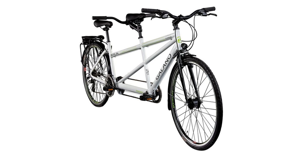 Gemeinsam radeln macht einfach mehr Spaß! Das Galano Oakland Tandem ist ein robustes Mountainbike für zwei Personen. Mit 21-Gang Schaltung meistert ihr auch steile Anstiege problemlos. Der Aluminiumrahmen hält das Gewicht mit nur 20kg angenehm niedrig. Die kräftigen Tektro V-Brakes und die grobstolligen MTraxx-Reifen (26x2,10 Zoll) geben Sicherheit auf jedem Untergrund. Vordere Rahmenhöhe 48cm für 155-170cm, hintere Rahmenhöhe 41cm für 145-160cm Körpergröße. Wird zu 85% vormontiert geliefert - ihr könnt also schnell losradeln. Perfekt für Paare, Eltern mit Kindern oder einfach Freunde, die gemeinsam die Natur erkunden wollen. Auf die Pedale, fertig, los!
