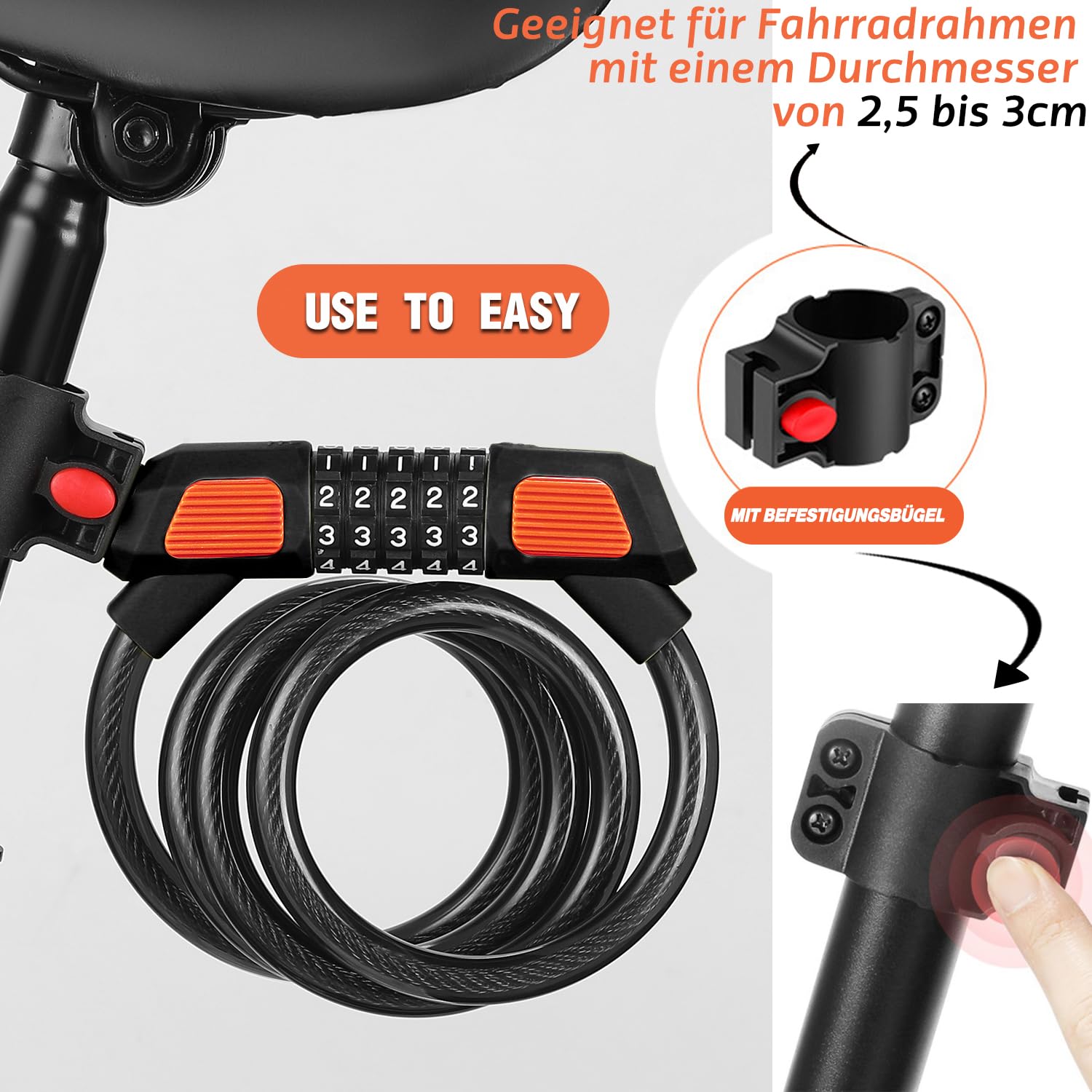 Sicherheit ohne Schlüssel! Dieses Ainiv Fahrradschloss mit 5-stelligem Zahlencode bietet 100.000 Kombinationsmöglichkeiten. 120cm langes Stahlseil mit 12mm Durchmesser - PVC-beschichtet, kratzfest. Einfach zu transportieren, inklusive Halterung für den Fahrradrahmen. Passwort beliebig änderbar - kein Schlüsselverlust mehr! Auch für Motorräder, Roller, Türen und Zäune geeignet. Mit diesem Schloss bist du immer auf der sicheren Seite!