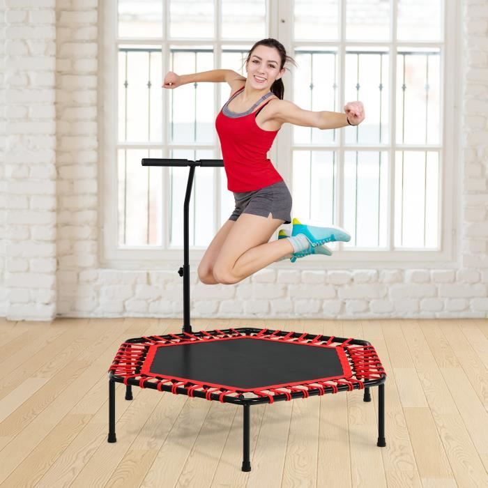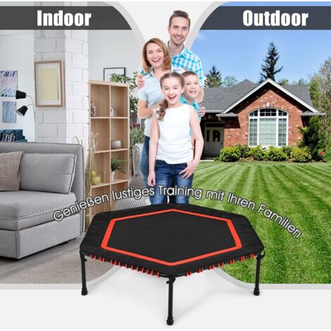 Spaß und Fitness in einem! Dieses praktische Mini-Trampolin mit 97cm Durchmesser bringt Bewegung in dein Zuhause. Super stabil bis 150kg belastbar - für Kinder und Erwachsene gleichermaßen geeignet. Die 32 Federn mit Sicherheitsschnallen sorgen für sanftes Hüpfen und Schutz vor Verletzungen. Die PVC-Randabdeckung ist weich gepolstert und die 6 Stahlbeine garantieren Standfestigkeit. Besonders praktisch: Das Trampolin ist faltbar und kann platzsparend hinter der Tür oder unter dem Bett verstaut werden. Mit gummierten Füßen für rutschfesten Stand und geräuscharmes Hüpfen. Perfekt für Indoor-Training, Garten-Spaß oder als Spielgerät für Kinder. Mach dein Zuhause zur Fitness-Oase!