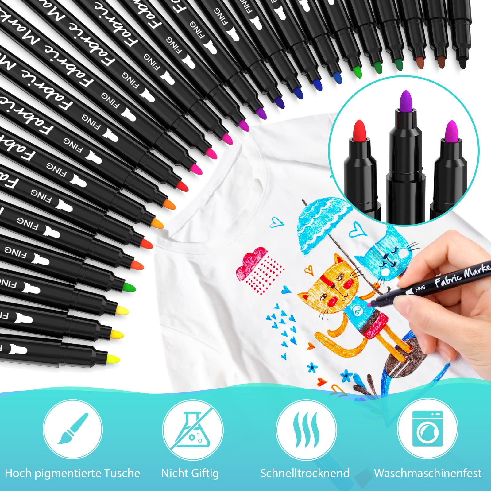 Lass deiner Kreativität freien Lauf! Mit diesen 12 Nurila Textilstiften kannst du T-Shirts, Stofftaschen, Schuhe und mehr individuell gestalten. Die waschmaschinenfesten Farben halten auch nach dem Waschen - wasserdicht und sonnenbeständig! Der verbesserte Faserstiftkopf ist reibungsbeständig und langlebig. Mit umweltfreundlicher Tinte auf Wasserbasis, die hell leuchtet und nicht verblasst. Einfach dein Design aufmalen, trocknen lassen und schon ist es waschfest. Perfekt für DIY-Projekte, Kindergeburtstage oder um langweilige Klamotten aufzupeppen. Aber denk dran: Nach dem Benutzen die Kappe wieder drauf, sonst trocknen die Stifte aus!