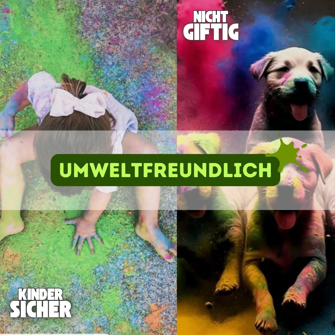 Alter, das wird bunt! Mit diesem Holi Farbpulver Set bringst du Farbe in jede Party. 5 Beutel à 100g in verschiedenen knalligen Farben - perfekt für Festivals, Fotoshootings, Hochzeiten oder einfach nur zum Spaß haben. Das Pulver ist komplett natürlich, ungiftig und wasserlöslich. Sogar für Haustiere unbedenklich! Einfach den Beutel schütteln, öffnen und das Pulver in die Luft werfen - schon hast du eine mega Farbexplosion. Die Farben waschen sich leicht aus Kleidung raus, aber nimm besser nicht deine Lieblingsklamotten. Für Kameras und Handys empfiehlt sich ne Schutzhülle, damit kein Pulver in die Geräte kommt. Pro Person am besten 3-5 Beutel einplanen für richtig viel Spaß. Ob Kindergeburtstag, Sommercamp oder Color Run - mit diesem Pulver wird jede Feier unvergesslich! Einfach ausprobieren und dich vom Farbrausch mitreißen lassen. Das ist echter Holi-Spaß pur!