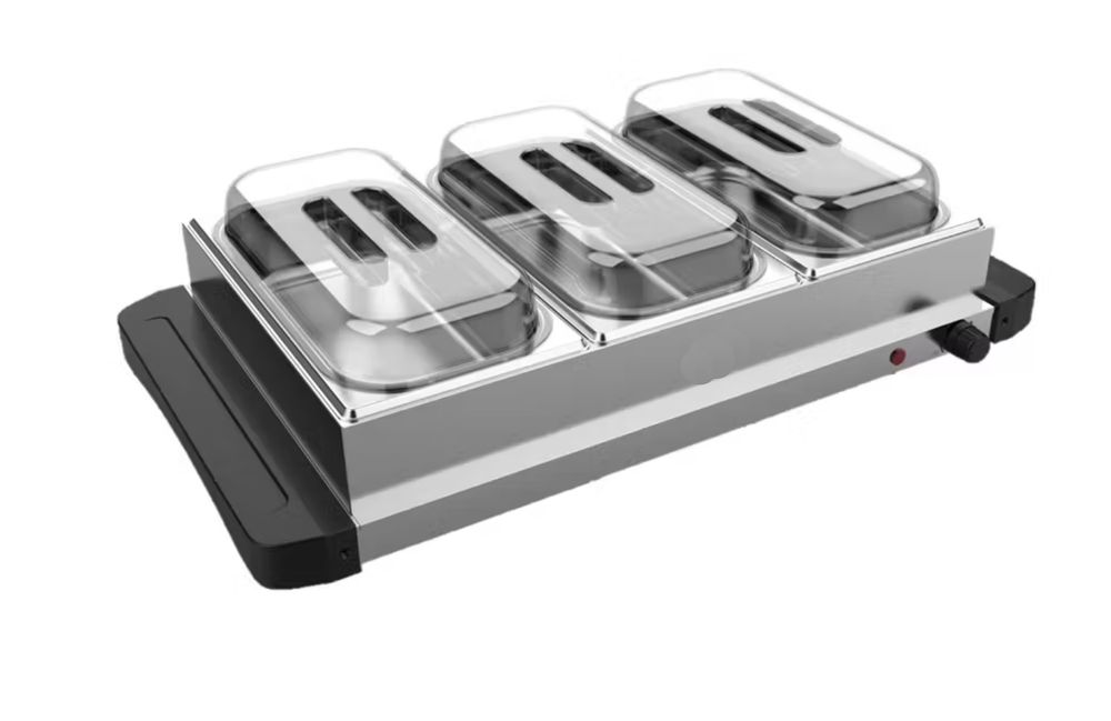 Essen warmhalten war noch nie so einfach! Diese 3-in-1 Warmhalteplatte aus Edelstahl hat drei separate Pfannen - perfekt um verschiedene Gerichte getrennt zu halten. Mit 7 Litern Fassungsvermögen ist sie ideal für Restaurant, Kantine oder die nächste Party zuhause. Die Temperatur lässt sich stufenlos von 30°C bis 85°C einstellen, damit jedes Gericht die perfekte Wärme behält. Das kubische Heizsystem verteilt die Hitze super gleichmäßig in allen drei Fächern. Praktisch: Der Wasserauslass vorne macht die Reinigung zum Kinderspiel. Mit 850 Watt heizt sie schnell auf und die LED-Anzeige zeigt dir immer den aktuellen Status. Inklusive sind drei Töpfe mit Deckel, zwei Edelstahl-Stäbchen und alles für den sofortigen Einsatz. Einfach Stecker rein - und dein Essen bleibt warm!