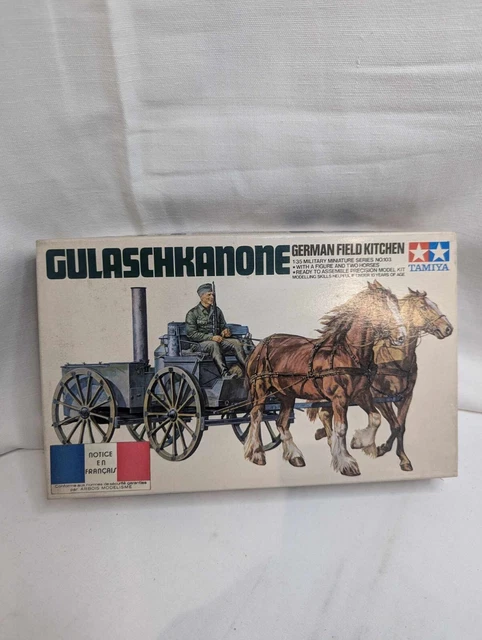 Historisches Modell zum Selberbauen! Die deutsche Feldküche (Gulaschkanone) aus dem 2. Weltkrieg im Maßstab 1:35 von Tamiya. Mit einer Figur für authentische Darstellung. Typische Tamiya-Qualität mit perfekter Passgenauigkeit. Achtung: Nicht für Kinder unter 14 Jahren! Perfekt für Modellbau-Fans und Militär-Historiker.