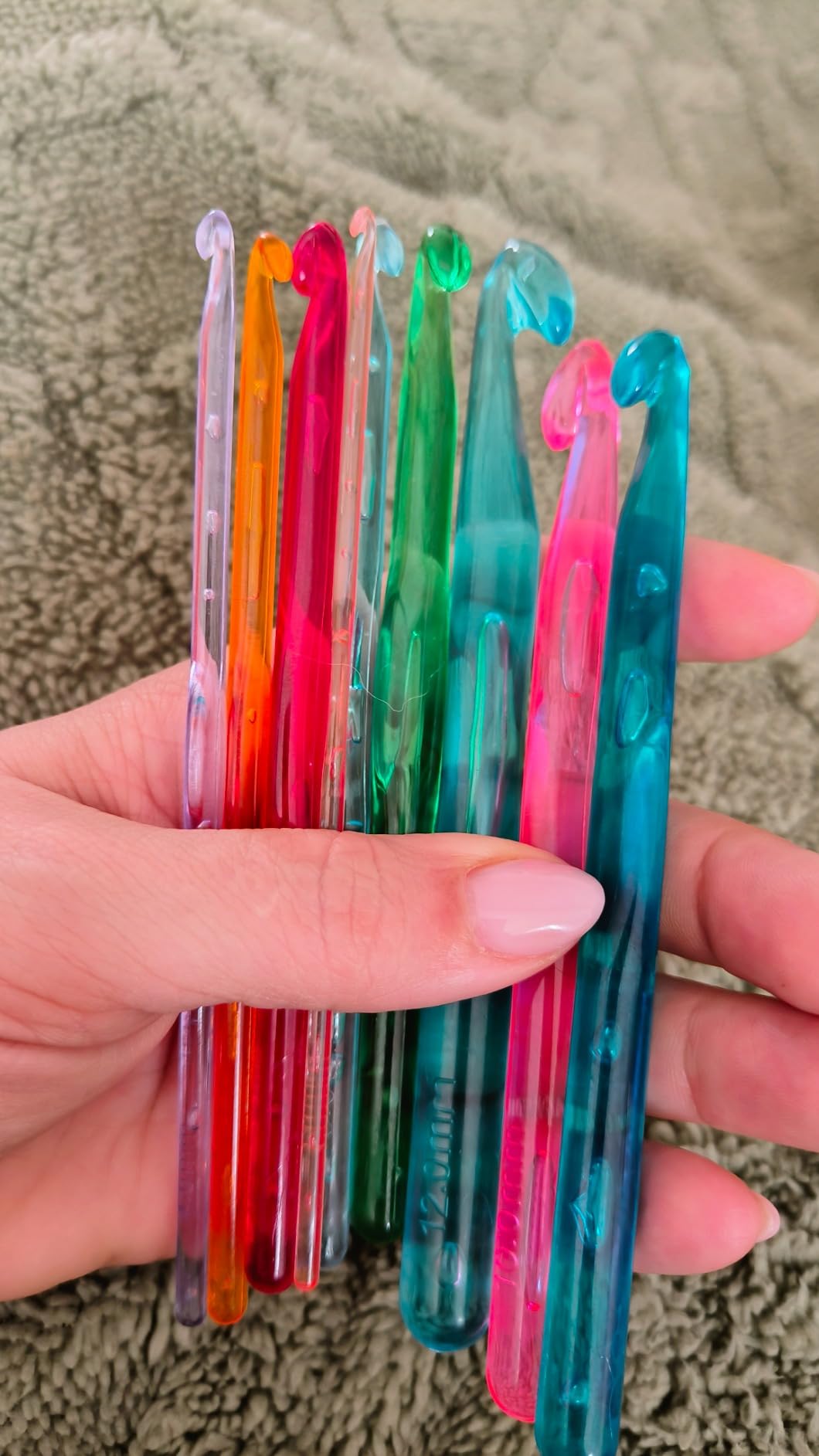 Perfekt für große Projekte wie Teppiche, dicke Decken, Schals oder grobe Wolle. Die transparenten Nadeln aus ABS-Kunststoff sind leicht und rutschfest.