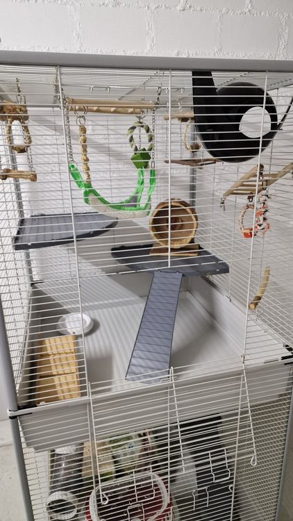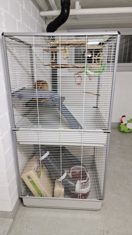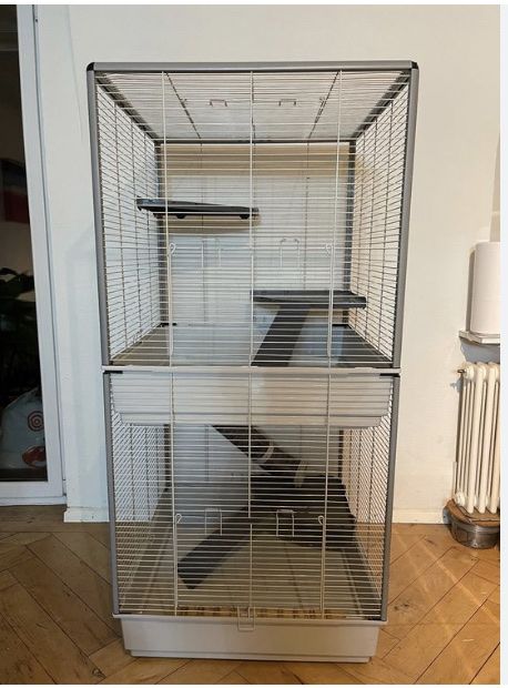 Wow, deine Frettchen werden diesen Käfig lieben! Der Ferplast FURET XL ist ein richtiges Luxus-Appartement für die neugierigen Tierchen. Mit stolzen 80x75x86,5 cm bietet er jede Menge Platz zum Toben, Schlafen und Erkunden.\\n\\nDas coole daran: Drei ganze Etagen warten darauf, erobert zu werden! Inklusive sind eine kuschelige Hängematte, praktische Röhren zum Durchkrabbeln und sogar eine Ecktoilette. Der grau lackierte Metallkäfig mit Kunststoffboden ist super stabil und einfach zu reinigen - einfach den Boden abnehmen und saubermachen.\\n\\nDie großen Türen mit Sicherheitsschloss machen das Füttern und Spielen total easy. Und das Beste: Er wird platzsparend verpackt geliefert und ist ratzfatz aufgebaut.\\n\\nFerplast ist ja bekannt für Qualität - made in Italy und seit Jahren der Hit bei Tierhaltern. Deine Frettchen werden's dir danken, versprochen! Perfekt für alle, die ihren kleinen Raubtieren was Gutes gönnen wollen.