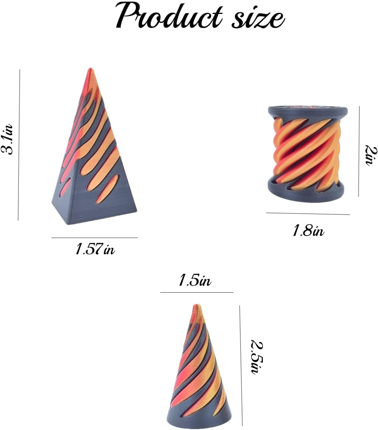 Einfach hypnotisierend! Diese 6 spiralförmigen Fidget Cones aus 3D-Druck sind das perfekte Anti-Stress-Spielzeug. Jedes Stück kombiniert eine Spirale mit einer anderen geometrischen Form und erzeugt faszinierende visuelle Effekte. Aus hochwertigem PLA-Kunststoff gefertigt, ohne scharfe Kanten. Perfekt um Nervosität abzubauen, die Konzentration zu steigern oder einfach nur die Hände beschäftigt zu halten. Ob im Büro, in der Schule oder zu Hause - diese kleinen Helfer bringen Entspannung und Spaß. Trainiert nebenbei die Feinmotorik und macht geometrische Formen begreifbar. Ein tolles Geschenk für Groß und Klein!