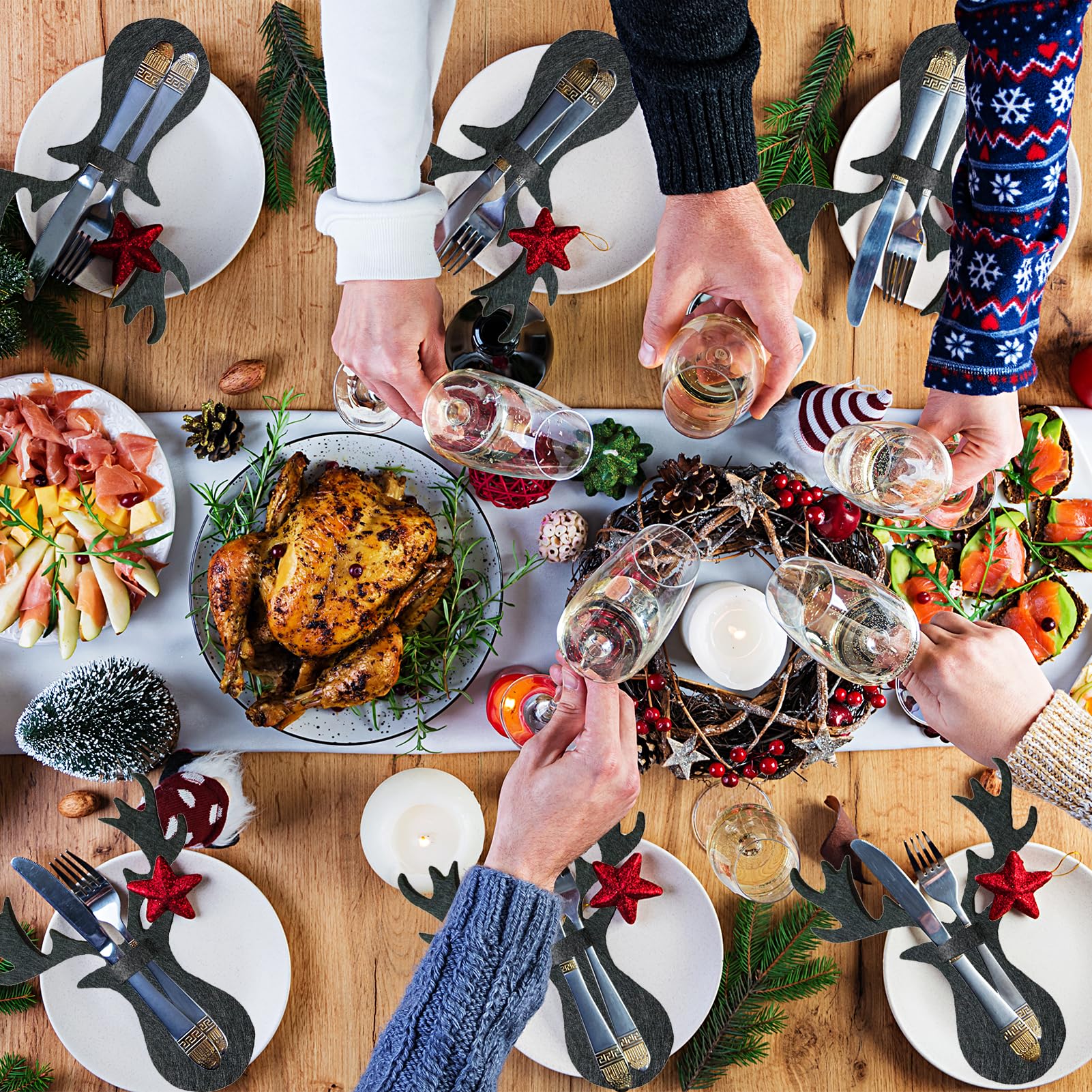 Verwandle deine Weihnachtstafel in ein festliches Erlebnis! Dieses Set mit 12 filzigen Besteckhaltern in Tannenbaum-Design bringt sofort Weihnachtsstimmung auf den Tisch. Jeder Halter misst ca. 18x20cm und bietet Platz für Messer, Gabel und Löffel. Aus hochwertigem Filz gefertigt der nicht verblasst und wiederverwendbar ist. Einfach das Besteck hineinstecken und schon sieht deine Gedeckordnung festlich aus. Perfekt für Weihnachtsessen, Feiertage, Partys oder als Geschenk. Mach dein Weihnachtsessen zu einem besonderen Erlebnis mit dieser charmanten Dekoration!