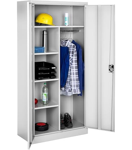 Richtig stabil und super praktisch - dieser DENIOS Flügeltürenschrank ist der perfekte Garderobenschrank für Werkstatt, Garage oder Gewerbe! Mit den Maßen 930x500x1950 mm bietet er jede Menge Stauraum. Aus robuster Stahlkonstruktion mit hochwertiger Einbrennbeschichtung - hält auch bei starker Sonneneinstrahlung super aus. Die Türen sind extra verstärkt und schlagen mit ca. 110 Grad Öffnungswinkel zueinander. Das coole Feature: Die Inneneinrichtung ist im 15-mm-Raster höhenverstellbar - du kannst also alles genau so einrichten wie du's brauchst. Mit Kunststoffgleitern als Schutz für Schrank und Boden. Ein echter Allrounder der einfach alles mitmacht!
