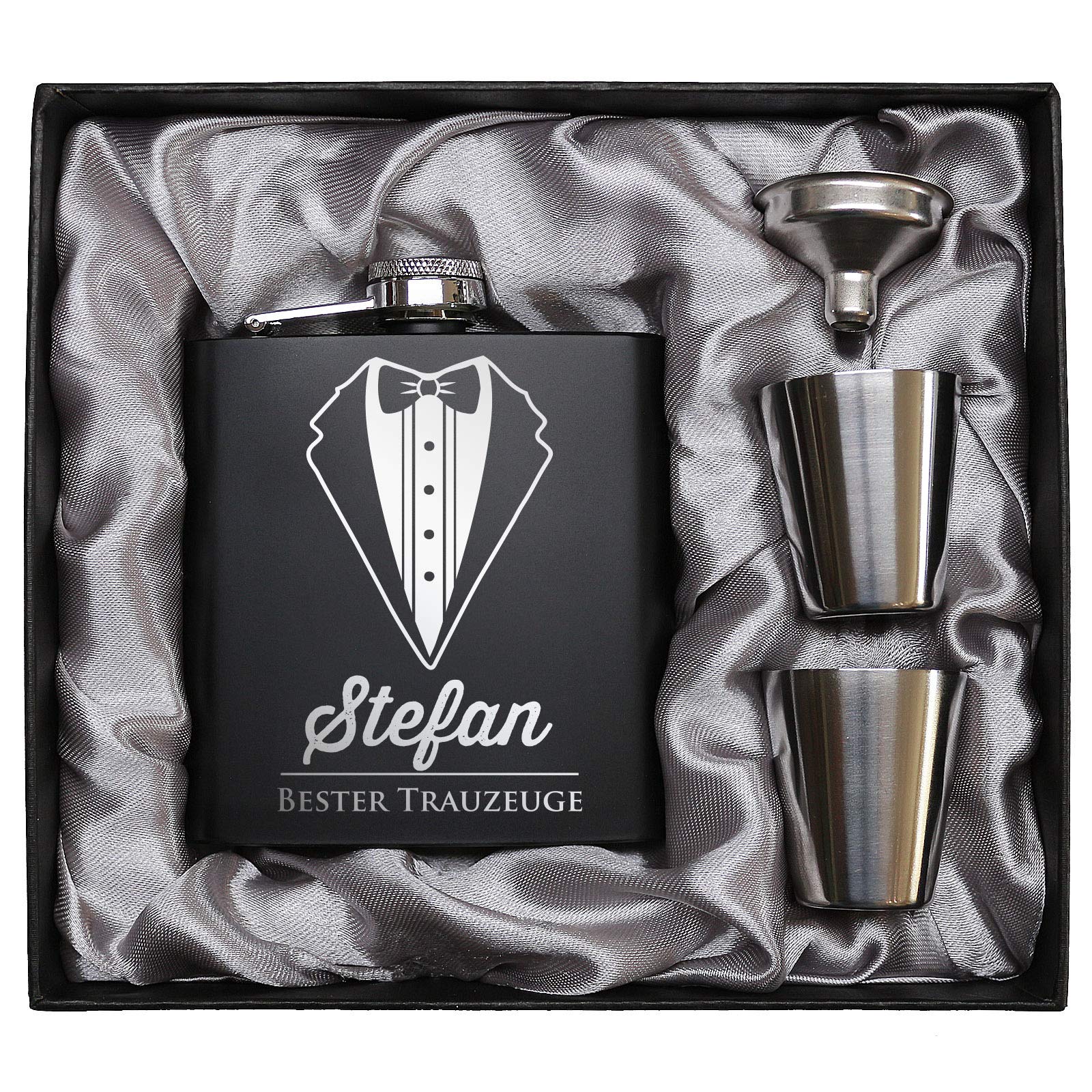 Deine Trauzeugin hat sich so viel Mühe gegeben? Jetzt wird's Zeit für ein besonderes Dankeschön! Dieser pink-rosa Flachmann im coolen Retro-Design ist das perfekte Geschenk für deine beste Freundin. Und das Besondere: Du kannst ihren Namen gravieren lassen - einfach beim Kauf angeben! Mit 180ml Fassungsvermögen (das sind 6oz) passt da eine ordentliche Portion ihres Lieblingsgetränks rein. Ob Whiskey, Schnaps oder Rum - der Flachmann aus rostfreiem Edelstahl hält alles aus und sieht dabei noch mega stylisch aus. Die pinke Lackierung gibt ihm diesen besonderen Vintage-Look, der einfach jeden anspricht. Perfekt gefüllt zu überreichen als lustiges Geschenk während der Hochzeitsfeier oder als bleibende Erinnerung an diesen besonderen Tag. Nicht nur praktisch für unterwegs, sondern auch eine witzige Deko für die Wohnung. Maße von etwa 9,5x9,5cm passen in fast jede Handtasche. Ein persönliches Geschenk, das von Herzen kommt und garantiert für Freude sorgt. Zeig deiner Trauzeugin, wie sehr du ihre Hilfe geschätzt hast - mit einem Geschenk, das sie immer an eure besondere Freundschaft erinnert. Einfach bestellen, Namen angeben und staunen lassen!