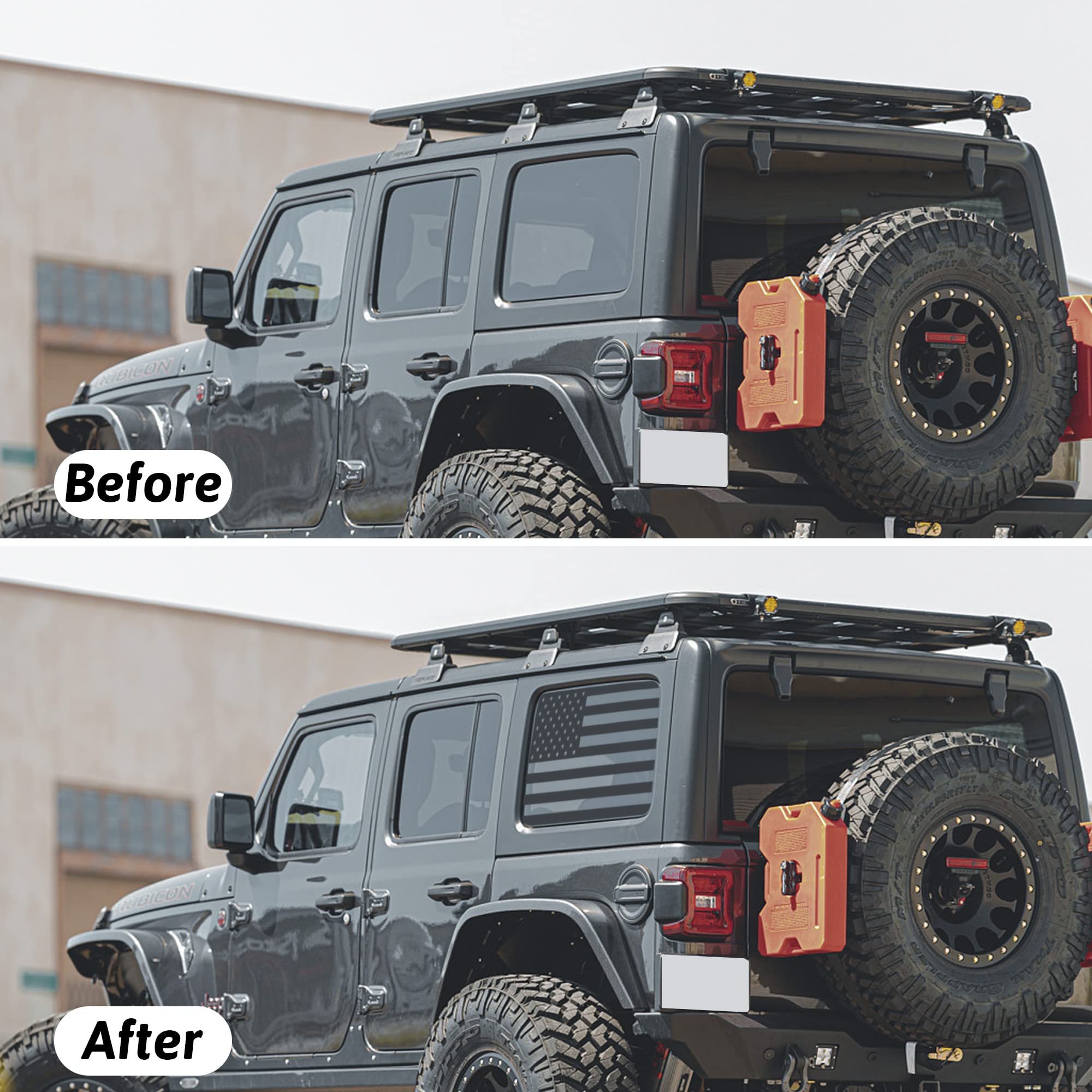 Bring American Style auf deinen Jeep! Diese coolen Aufkleber im USA-Flaggen-Design passen perfekt auf die hinteren Seitenscheiben vom Jeep Wrangler JL/JLU 2-Türer (2018-2023). Aus hochwertigem Vinyl, leicht zu montieren und rückstandslos entfernbar. Mach deinen Jeep zum echten Hingucker!