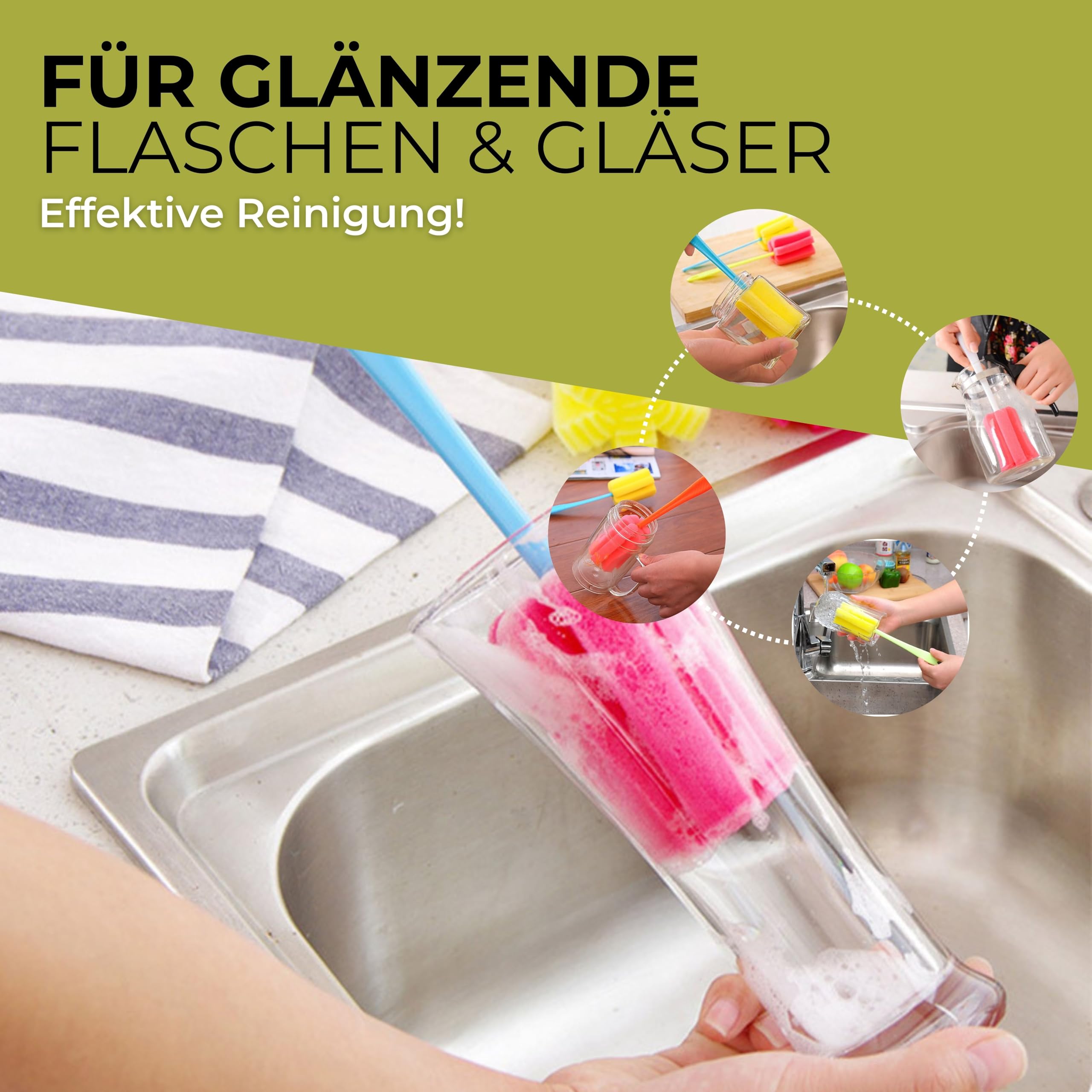Puh, Flaschen sauber kriegen kann echt nerven - aber mit diesen Reinigungsbürsten wird's easy! Im 4er-Set in verschiedenen Farben (weiß, blau, grün, rosa), jeweils 25 cm lang. Der Memory-Schaum-Kopf passt sich perfekt an und wird nicht schnell kaputt. Mit den 17,5 cm langen Griffen kommst du auch in die tiefsten Ecken von Flaschen, Gläsern oder Thermoskannen. Die feinen Poren machen richtig viel Schaum - so wird alles blitzeblank! Und mit dem Aufhänger am Ende trocknen die Bürsten super schnell. Perfekt für Babyflaschen, Wasserkocher oder eben alles, was ne gründliche Reinigung braucht.