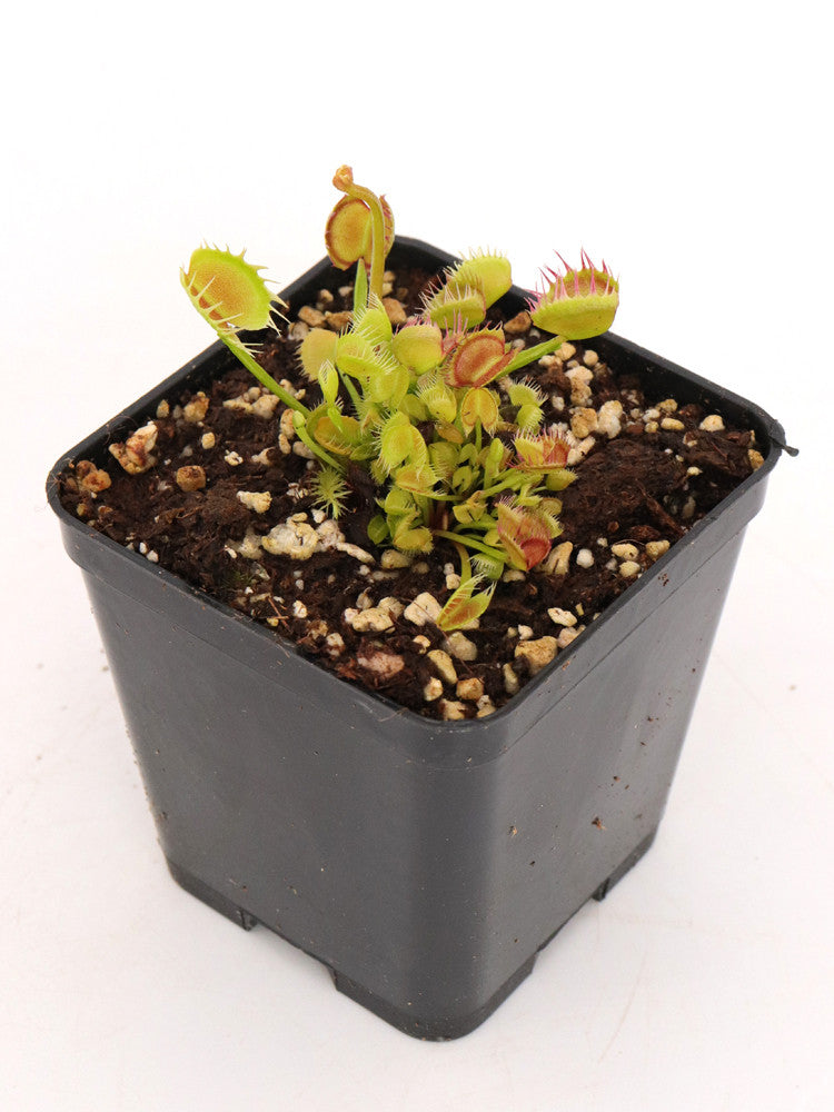 Wow, diese Venusfliegenfalle 'Flexx' ist ja der absolute Hingucker! Mit ihren extra langen, gruseligen Zähnen sieht sie aus wie aus einem Fantasy-Film. Die fleischfressende Pflanze fängt lästige Fliegen einfach selbst - total praktisch! Im 9cm Topf kommt sie gut entwickelt bei dir an und ist super pflegeleicht: Viel Sonne, kalkfreies Wasser und feuchtes Substrat, mehr braucht sie nicht. Sie ist sogar winterhart und überlebt draußen mit etwas Schutz. Im Herbst zieht sie sich in ihre Zwiebel zurück und kommt im Frühjahr wieder. Wenn die Fallen nach 3-5 Mal Zuschnappen absterben, wachsen einfach neue nach. Ein faszinierendes Naturwunder für Anfänger und Profis - aber beeil dich, die sind schnell ausverkauft!